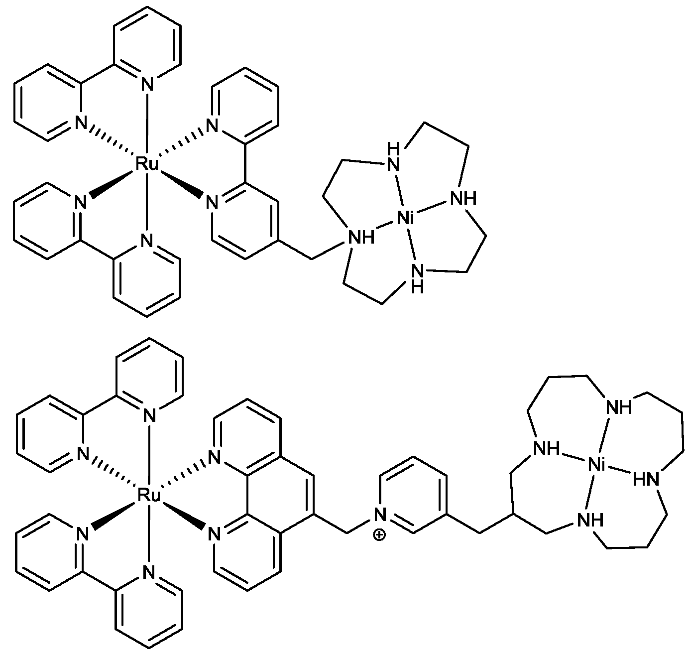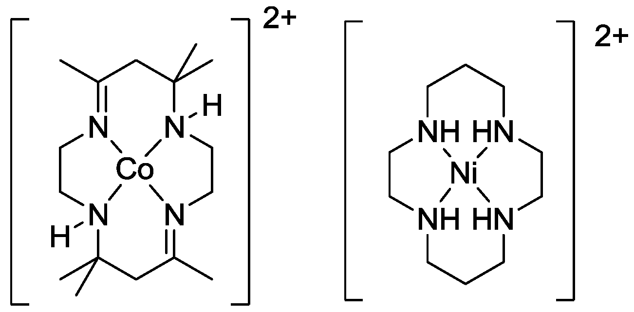 N-rac-CoHMD2+ (left) and Ni(II)-cyclam (right) complex.