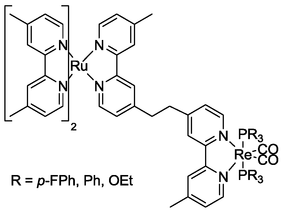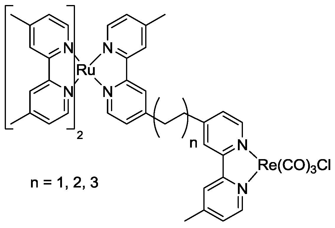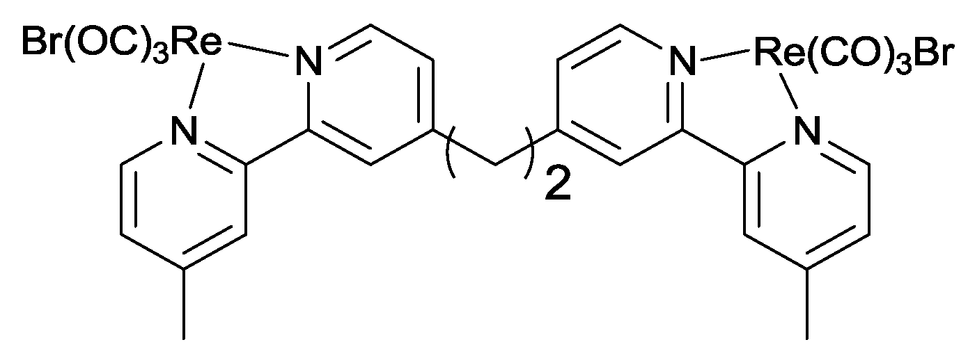 - van Wallendael, S.; Shaver, R.J.; Rillema, D.P.; Yoblinski, B.J.; Stathis, M.; Guarr, T.F. Ground-state and excited-state properties of monometallic and bimetallic complexes based on rhenium(I) tricarbonyl chloride: effect of an insulating vs a conducting bridge. Inorg. Chem. 1990, 29, 1761–1767. [Google Scholar]