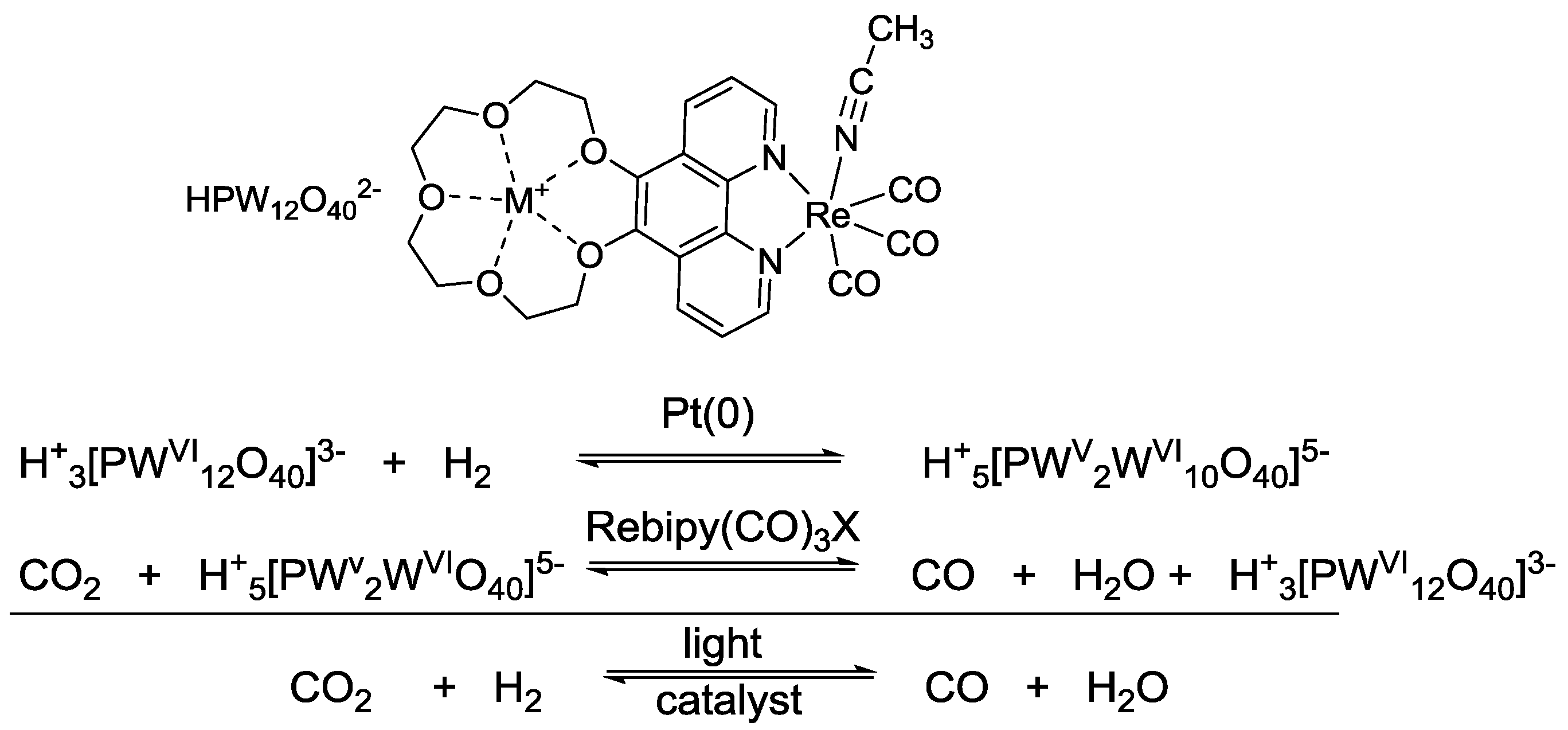 As amine sacrificial donors react to undesirable site products during the catalytic cycle, one of the most challenging goals is to develop catalytic systems which are able to quench the excited state (3MLCT) without sacrificial agents. In this context, Neumann et al. published an organometallic-polyoxometalate hybrid complex that is capable of replacing sacrificial amines in the photoreduction of CO2 by hydrogen (Figure 8) [122]. A first important reaction step is the oxidation of hydrogen forming two protons and two electrons, which has been realized by using the Keggin-type polyoxometalate H3PW12O40 as oxidizing agent. This polyoxometalate was linked to a photocatalyst by coordination of 5,6-(15-crown-5)-1,10-phenanthroline (L) and thus proton and electron transfer between the H2 oxidative site and the CO2 reductive site is supported. However, quantum yields and turnover frequencies in the reduction of CO2 in this system are lower than in some previous rhenium and ruthenium catalyzed photoreductions using amines as sacrificial electron donors.