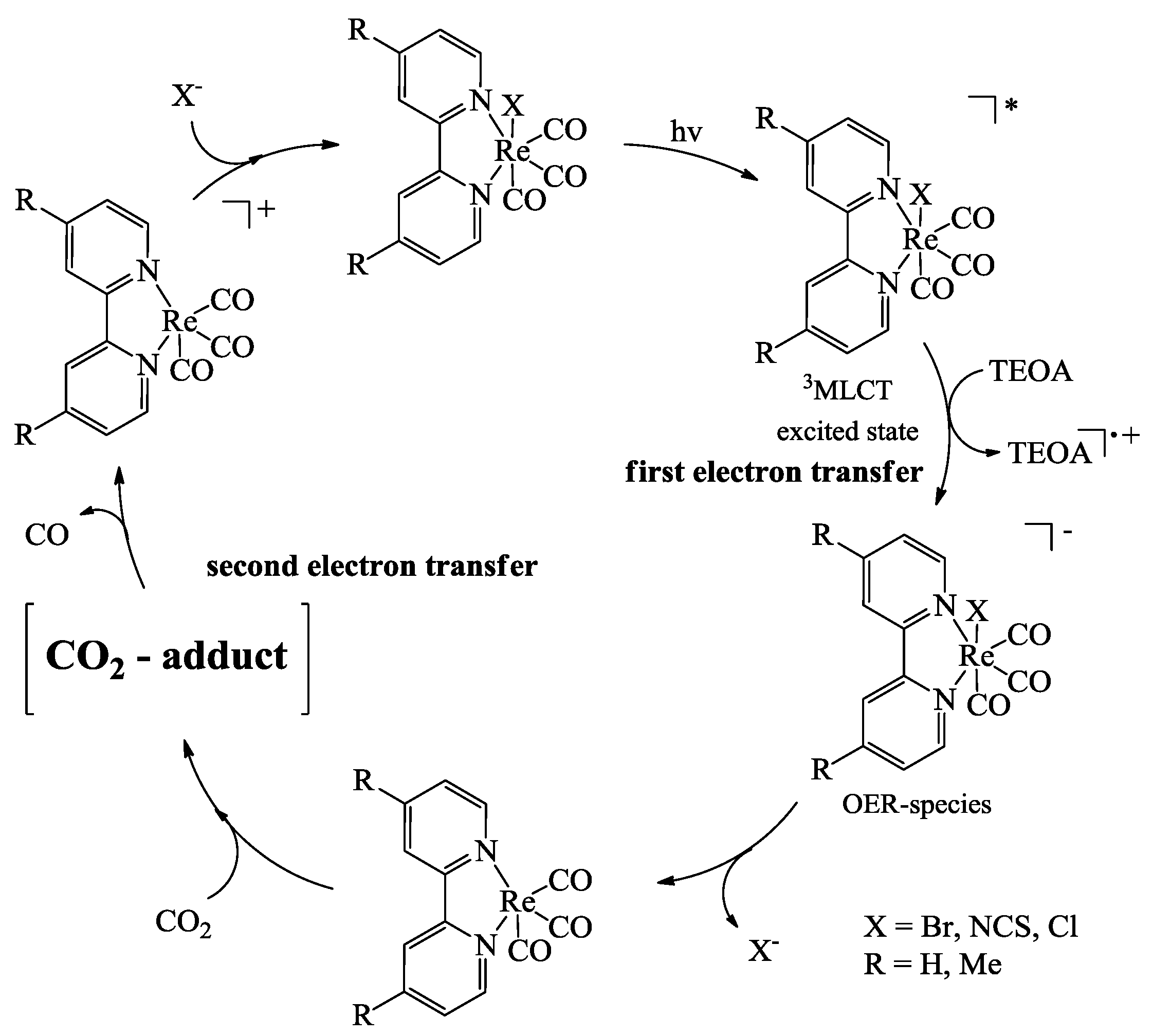 To date, the most selective catalytic reduction site for the photoreduction of CO2 are rhenium(I) systems. These selectively form CO from CO2 with only small amounts of hydrogen as a by-product [63]. The first reported Re(I)-type complexes were [Re(bpy)(CO)3X] (X = Cl, Br), affording quantum yields of up to 0.14 [77,78]. Mechanistic aspects are summarized and discussed in recently published reviews [13,14,15]. A central role in reduction half-cell reaction with Re(I) complexes is ascribed to the one-electron reduced species (OER). The reduction site is capable of transferring the electron that is provided from the electron donating site to the CO2 molecule. In reports on mechanistic investigations of this half-cell reaction, this OER is simply formed by one-electron reduction of the 3MLCT state of the Re(I) complex via TEOA (triethanolamine), which forms the ground state of the OER. This gives an unstable 19 electron species in which a coordination site becomes available by dissociation of the ligand X [78]. Subsequently, a CO2 adduct can be formed via nucleophilic attack of the rhenium center on the electrophilic carbon atom of the CO2 molecule (Scheme 2). The intermediates of the catalytic cycle cannot be unambiguously labeled, but at least several carboxylato-metal complexes of rhenium have been isolated, characterized, and their reactivity towards decarboxylation studied [79,80].