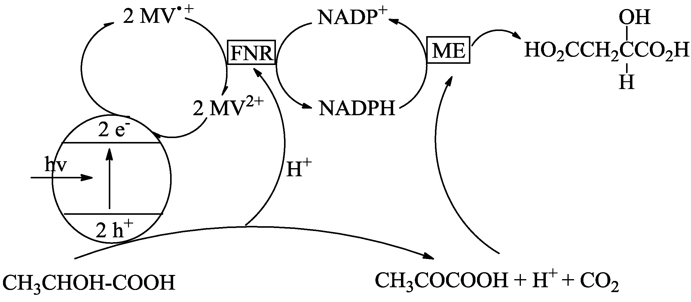 By varying the tridentate ligand site, Tong et al. could show that anionic tridentate ligands compared to neutral ligands demonstrate an increased picoline/water substitution rate which results in higher activity of the catalysts. These results demonstrate a correlation between the activity of WOCs and ligand properties, providing important information for future catalyst design. However, water oxidation in the absence of sacrificial acceptors to date was only realized in heterogeneous systems. For example Kudo et al. developed an Ag cocatalyst-loaded ALa4Ti4O15 (A = Ca, Sr, Ba) photocatalyst, which reduces CO2 to CO and HCOOH in aqueous suspension without any additional sacrificial reagents [140]. Furthermore Kajino et al. have been able to combine reduction of CO2 to HCOO- and water oxidation with a p-type InP/Ru-complex polymer hybrid photocatalyst connected to TiO2. In this case, water is the donor of electrons, as well as the source of protons. The conversion efficiency (solar energy to chemical energy) of this catalytic process is 0.03–0.04%. Therefore, an electrical bias-free reaction approaching photosynthesis was found. Further optimization in selectivity, as well as efficiency, can be achieved by configuration of the energy band, variation of catalyst structure, as well as conjugation conformation [141]. An alternative heterogeneous approach was developed by Yoneyama et al. in 1992 (Scheme 7) [142,143]. In this case, malic acid was synthesized from lactic acid and CO2 using a multicomponent system containing a cadmium sulfide suspension as photocatalyst, methylviologen (MV) as electron relay, and malic enzyme (ME) and ferredoxin-NADP+ reductase (FNR). Firstly, photogenerated electrons are transferred from the cadmium sulfide photocatalyst to MV2+ and the reduced MV provides the electrons to reduce NADP+ and H+. The resulting hole in the conduction band of the semiconductor particles leads to a potential which is adequate to regenerate the photocatalyst and to oxidize lactic acid. The resulting pyruvic acid is then converted to malic acid by reaction with CO2 and NADPH in a ME-catalyzed process. This catalytic cycle therefore consists of two coupled photoredox reactions. First, the reduction of MV2+, and, second, the oxidation of lactic acid. The C-C bond formation between CO2 and pyruvic acid takes place in the absence of light with the quantum efficiency of this system being around 2.5% [142,143].