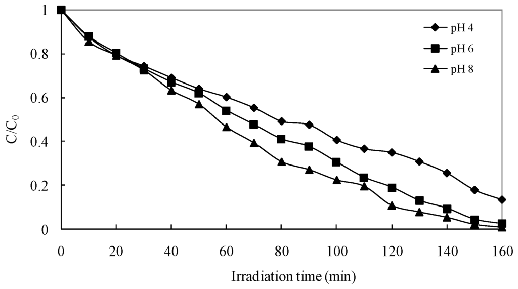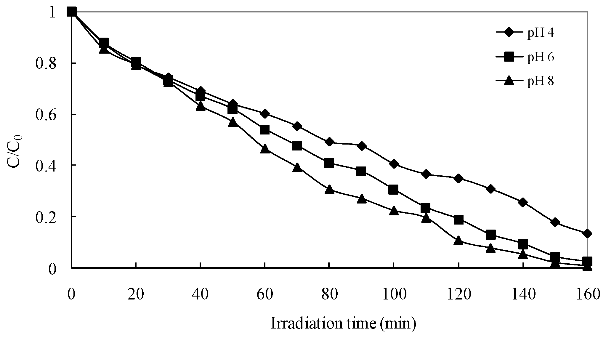 Figure 5. The results indicated that the degradation rate decreased with a decrease in pH, and it proceeded much faster under an alkaline pH. When the initial pH rose from 4.0 to 8.0, the degradation rate of AO within 160 min increased significantly from 86.7% to 99.0%. The observed increase of the degradation rate with an increase in pH can be attributed to the high hydroxylation of the photocatalyst’s surface, due to the presence of a large quantity of OH