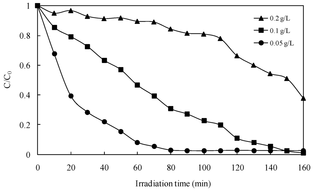 In photocatalytic processes, the amount of photocatalyst is an important parameter that can affect the degradation rate of organic compounds. In order to obtain the optimum catalyst dosage, the relationship between the dosage and degradation rate was investigated, as shown in
