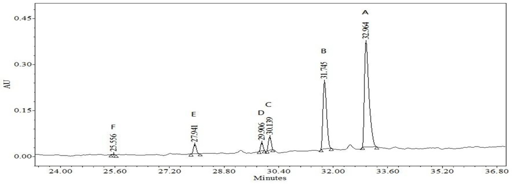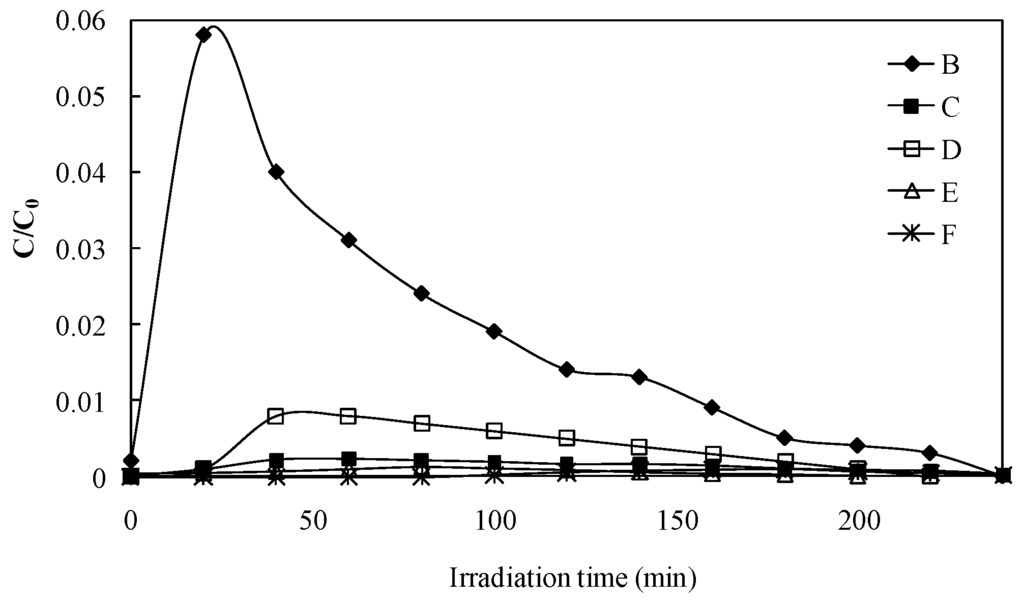 N-de-methylated products obtained from the photodegradation of the AO dye as a function of the irradiation time. Curves B–F correspond to the peaks B–F in