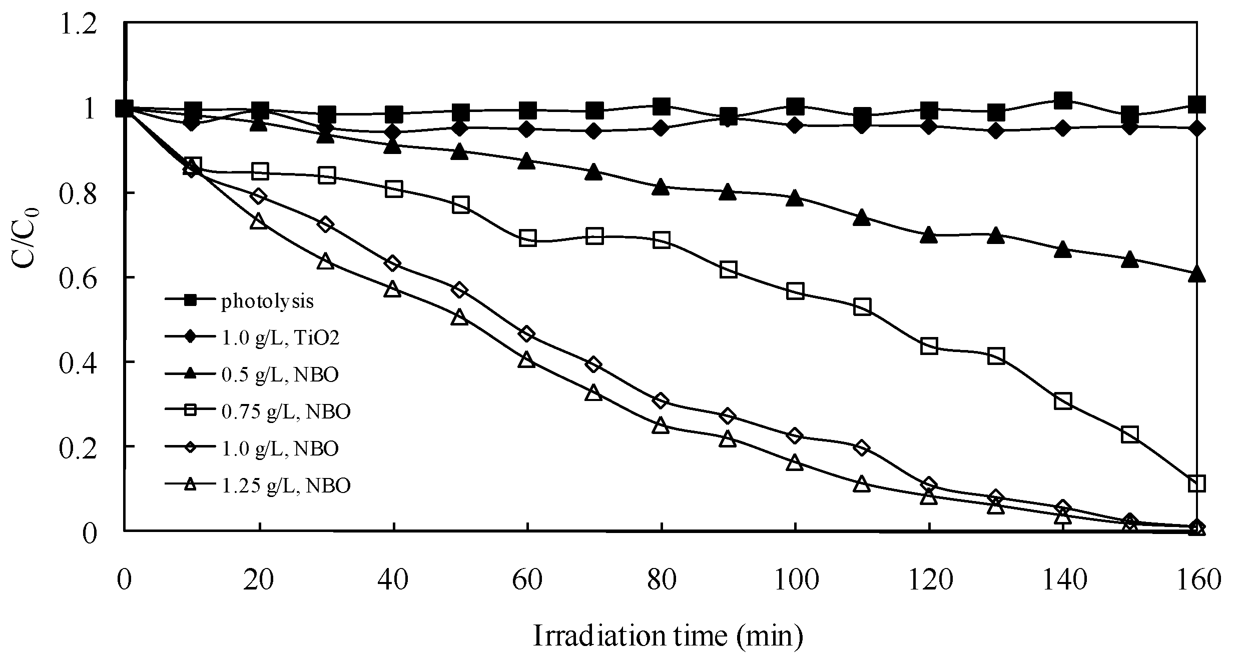 Figure 4. The results clearly show that degradation under visible light irradiation without catalysts for 160 min was negligibly small, compared with the results obtained in the presence of NaBiO