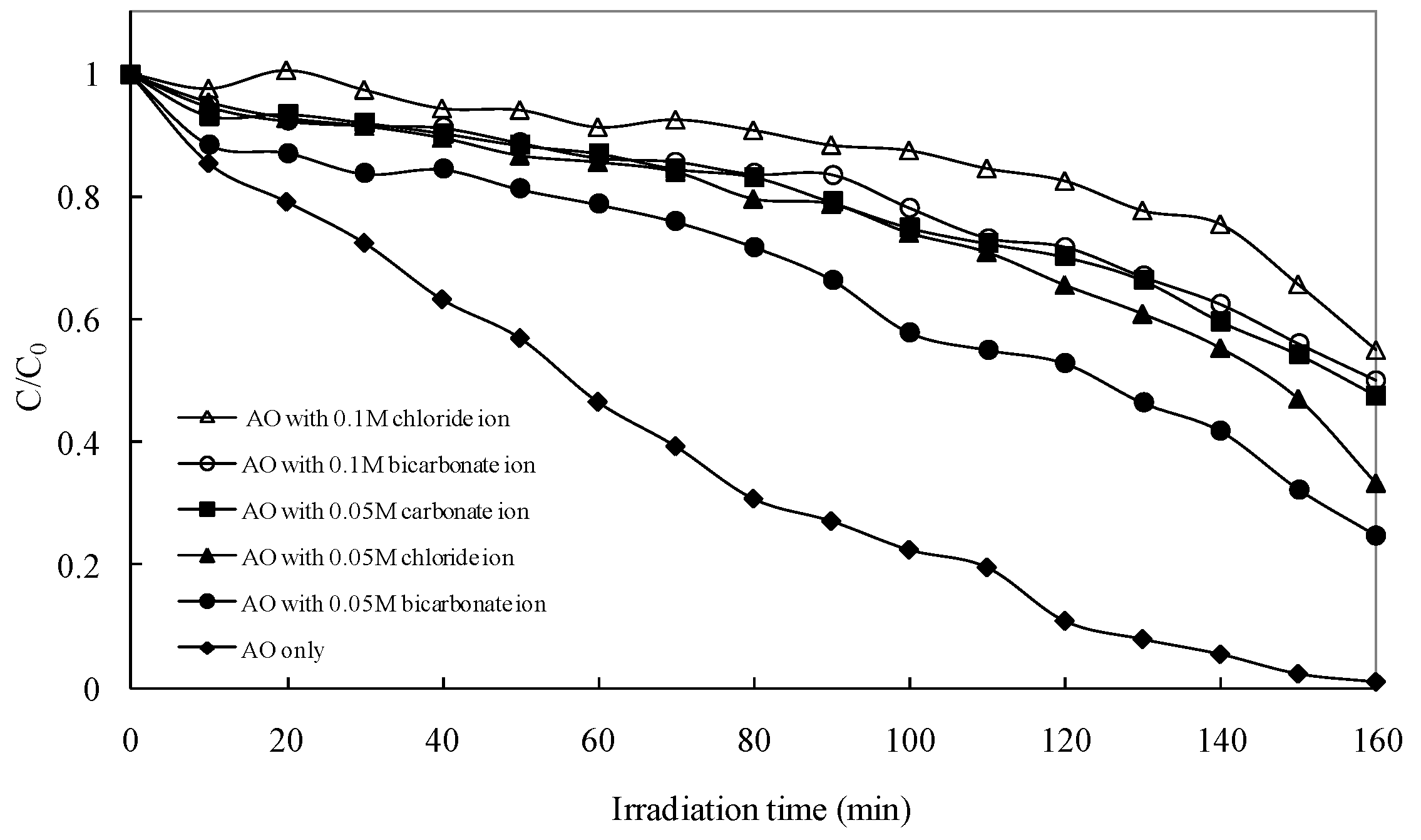 Figure 7). To investigate the effects of variations of the concentration of anions on the degradation rate of AO, chloride and bicarbonate were also added at a different concentration (0.1 M) in the initial solution. It can be seen that the photocatalytic degradation efficiency of AO decreases further with increasing the concentration of anions. Inhibition effects of anions can be explained as the reaction of hydroxyl radical with anions that behaved as