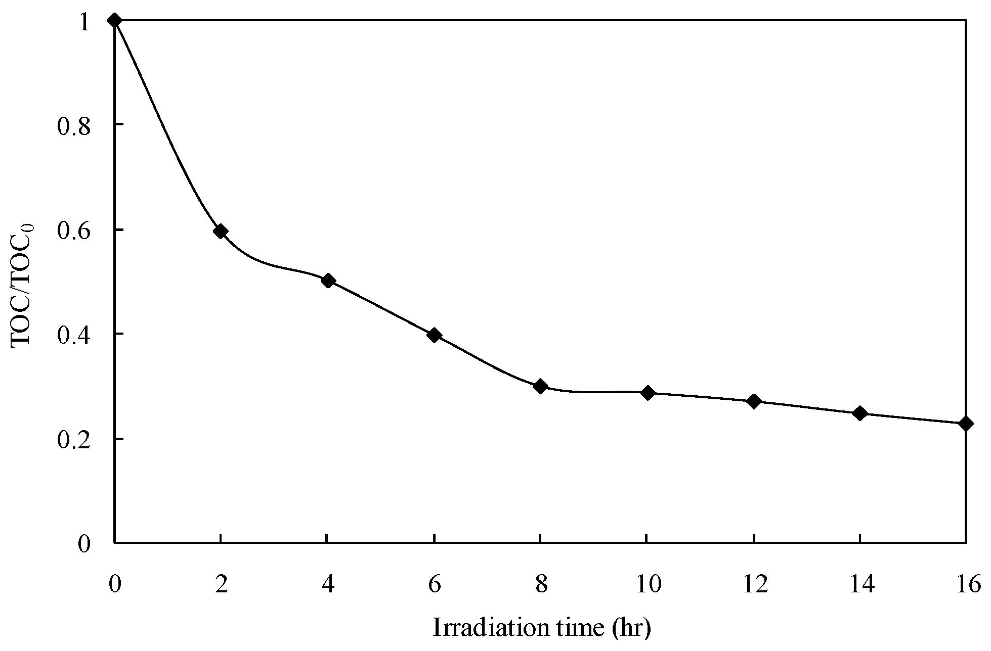 2 and of the heteroatoms into inorganic anions that remain in solution. In order to study the total mineralization of AO, the determination of total organic carbon (TOC) was carried out as a function of the irradiation time. The decrease in the TOC percentage of AO during the photocatalytic degradation is depicted in