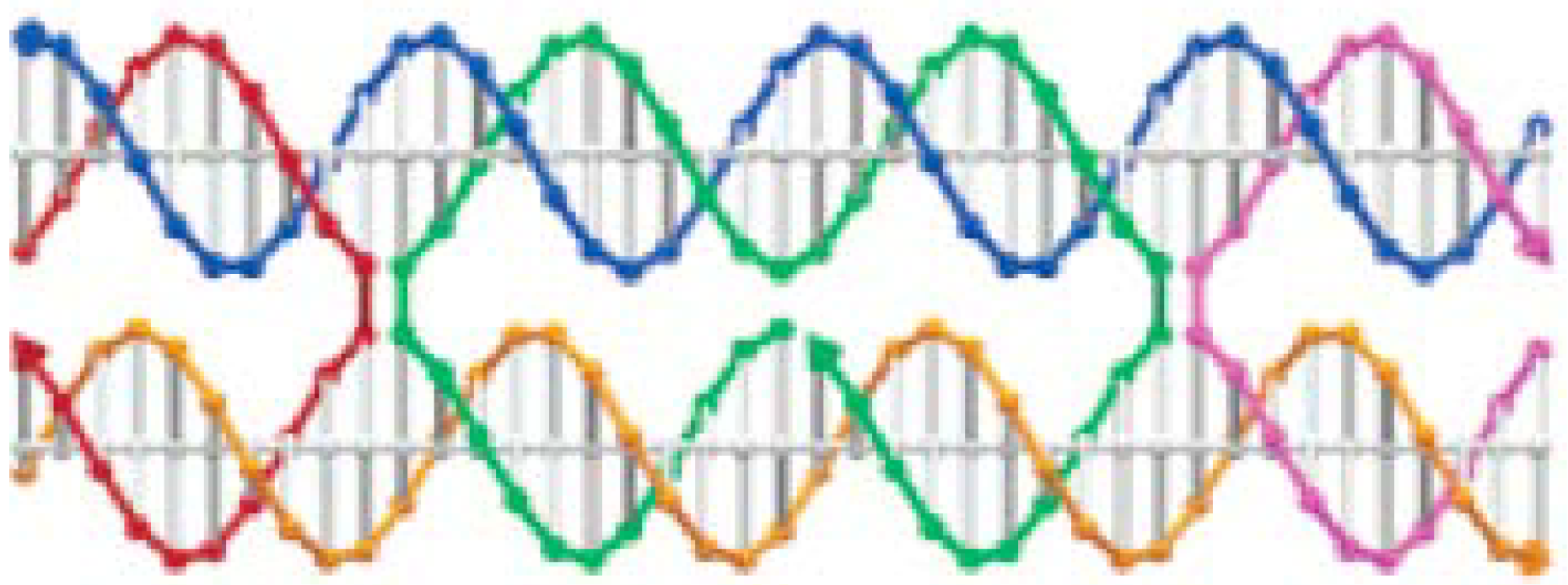A schematic of DX DNA. Each single strand of DNA is shown in a different color. Small circles represent the position of each phosphate and vertical grey lines represent the base pairs. Note that the red, green, and pink strands cross over between both double helices. Reprinted with permission from Ref. [48] Copyright 2004 American Chemical Society.