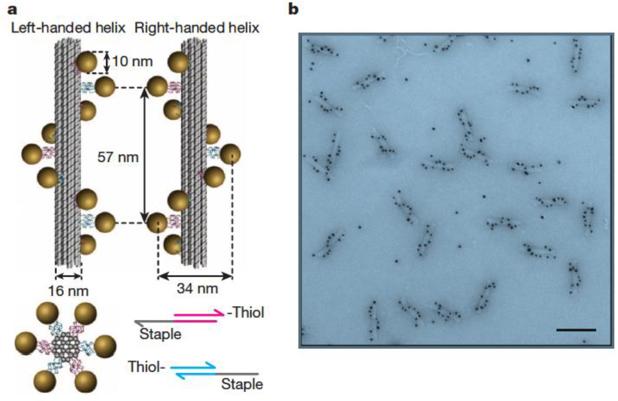 (a) A DNA origami rod (grey) can be synthesized with outward facing staple strands which contain a thiol group. Versions can be made where thiols can trace either a left-handed or right-handed helical path over the surface of the rod; (b) GNPs can be attached to the thiols and the resulting helical arrangement visualized via TEM. Reprinted by permission from Macmillan Publishers Ltd from ref. [57] copyright 2012.