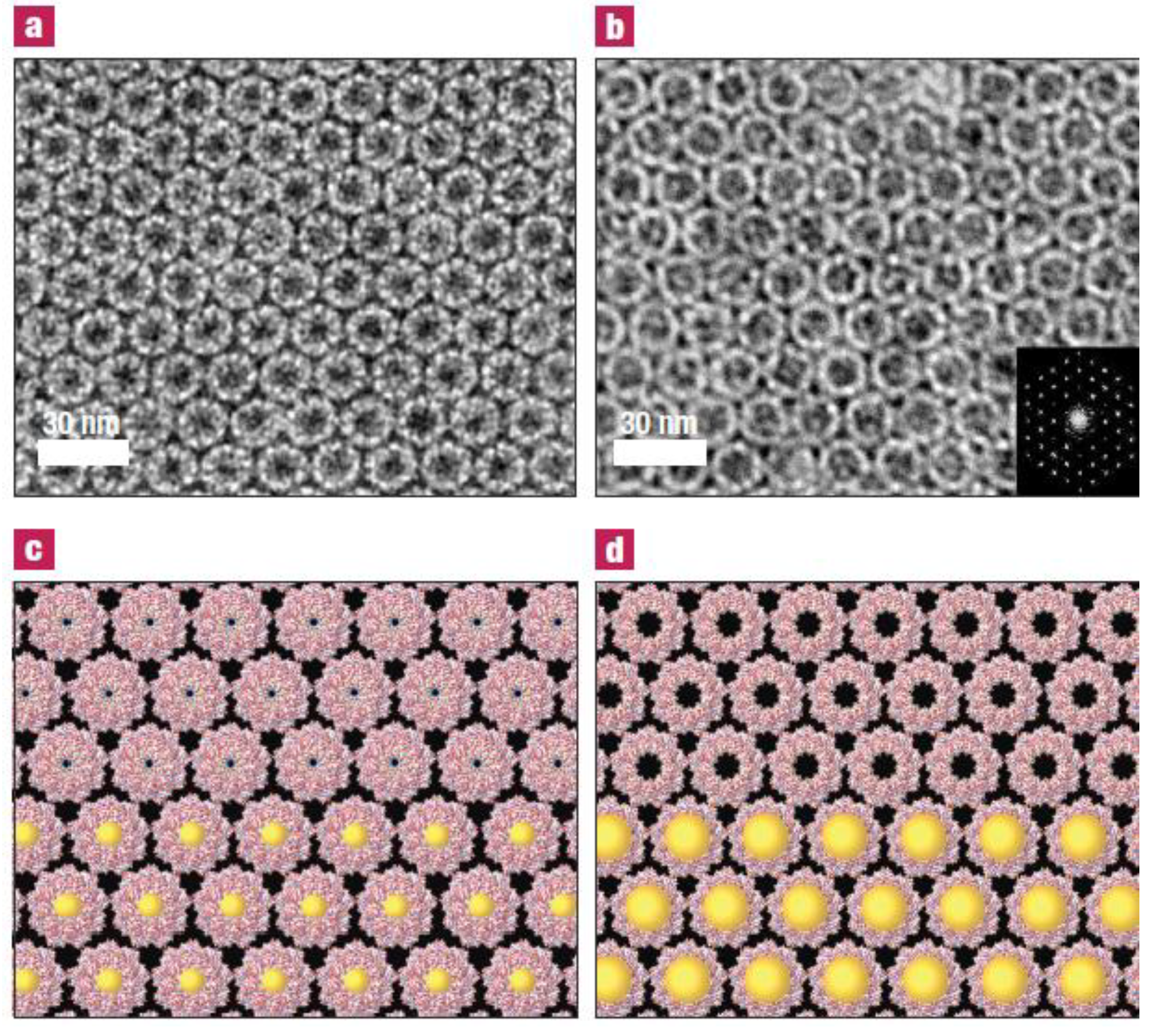 (a) Negatively stained TEM image of beta chaperonin which forms a 2D crystal; (b) Negatively stained TEM image of beta chaperonin mutant with increased pore size; (c) Schematic of (a) showing 5 nm GNPs (yellow) binding in the 3 nm pores; (d) Schematic of (b) showing 10 nm GNPs binding in the 9 nm pores. Reprinted by permission from Macmillan Publishers Ltd from ref. [78] copyright 2002.