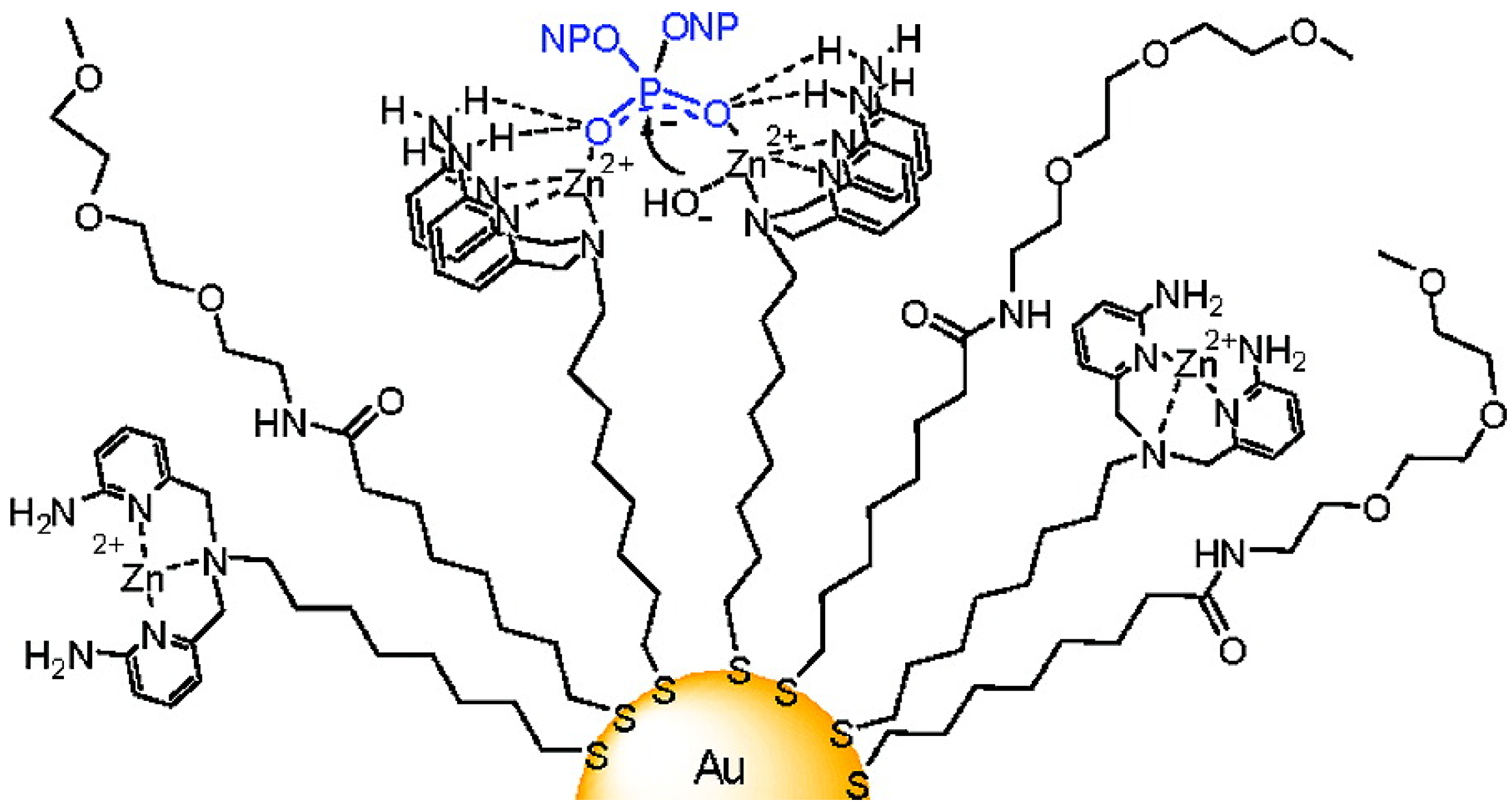 The catalytic properties of liganded GNPs have been utilized in sensors. Bonomi et al. [131] produced such a system. Here the GNP is coated with triazacyclononane·Zn (II), known to catalyze transphophorylation of 2-hydroxypropyl-4-nitrophenylphosphate (HPNPP) [121] as discussed above. This produces p-nitrophenol whose concentration can be monitored by absorbance at 400 nm. This feature was exploited to produce a sensor able to report on the activity of a protease, subtilisin A. An intact oligoanionic peptide substrate was able to bind to the GNP surface due to the presence of the positively charged ligand on the surface. The presence of the peptide on the surface blocked the reaction with HPNPP. However, when the enzyme digested the peptide substrate this binding was abolished and the reaction with HPNPP could occur leading to a change in absorption signal. The system was shown to work for detection of the activity of other enzymes, which changed the negative charges on their substrates.