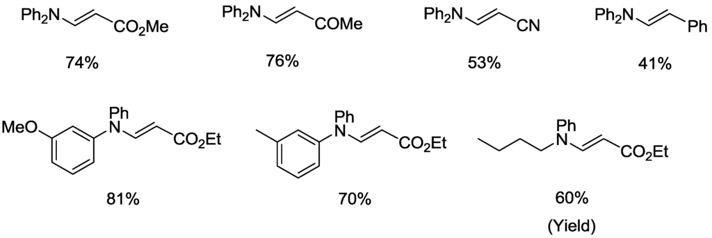 The reactions of various olefins with amines were examined under the optimized reaction conditions (Scheme 1). The reactions of diphenylamine (1) with various electron-deficient olefins such as methyl acrylate, methyl vinyl ketone, acrylonitrile, and styrene proceeded smoothly to give the corresponding products in good yields. The reaction also tolerated secondary aromatic amines such as 3-methyldiphenylamine, 3-methoxydiphenylamine, and n-butylphenylamine, to afford the corresponding enamines in good yields