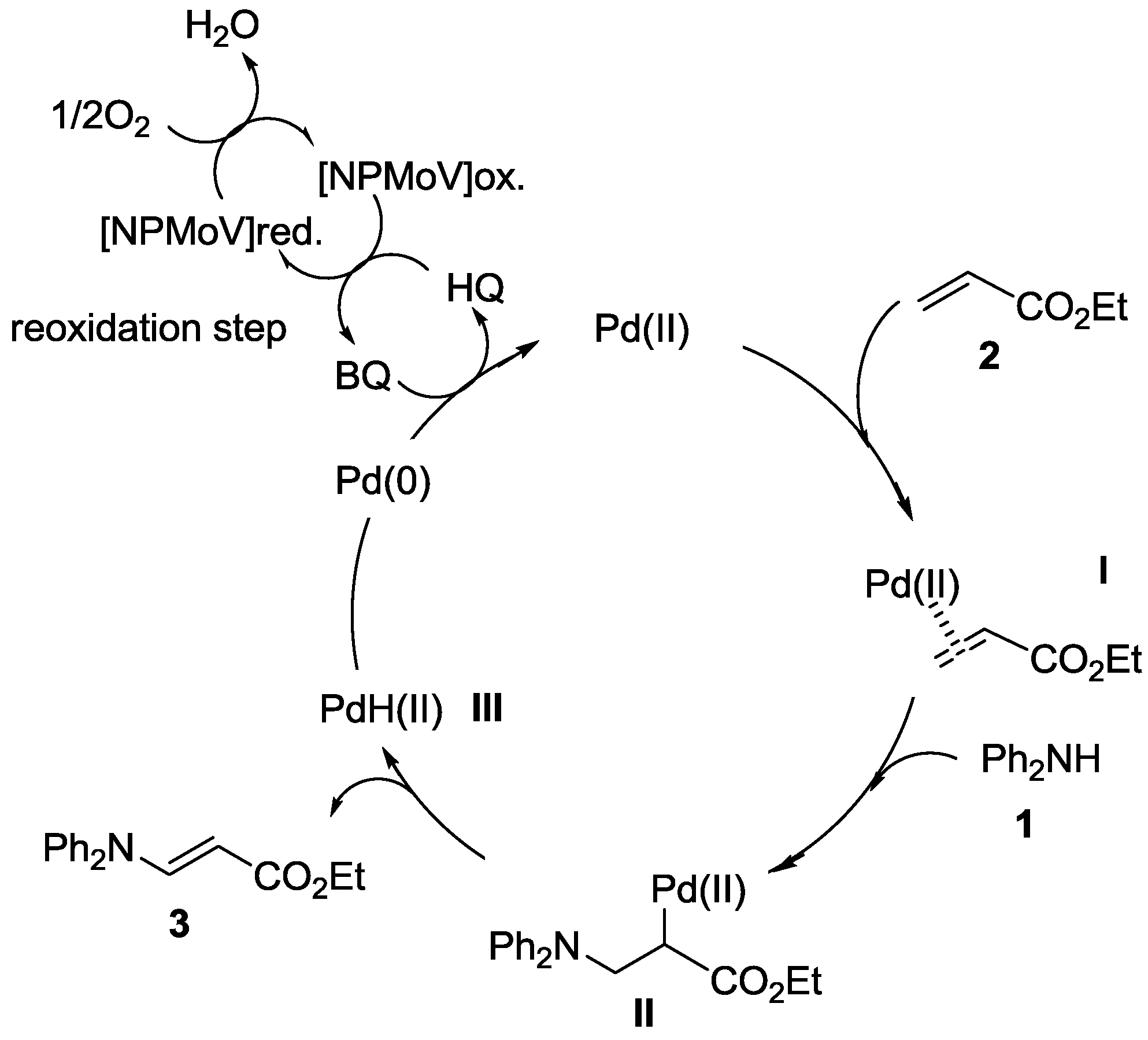 In the reoxidation of Pd(0) to Pd(II), as we previously reported [53,54], BQ functions as an efficient oxidizing agent for Pd(0), leading to disproportionation, affording Pd(II) and HQ. HQ is dehydrogenated to BQ by dioxygen and NPMoV (Scheme 2).