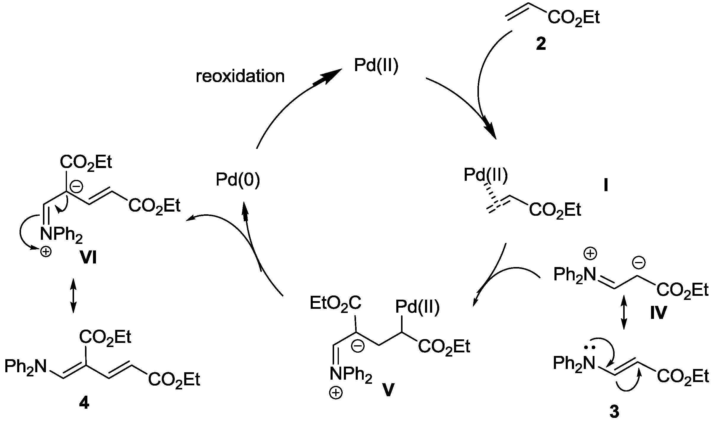 In the final part of this review, we report the Pd-catalyzed oxidative amination reaction of electron-deficient olefins using aromatic primary anilines in the presence of air (O2) as the sole oxidant, without the need for an external reoxidant, to give the corresponding enamine derivatives in high yields.