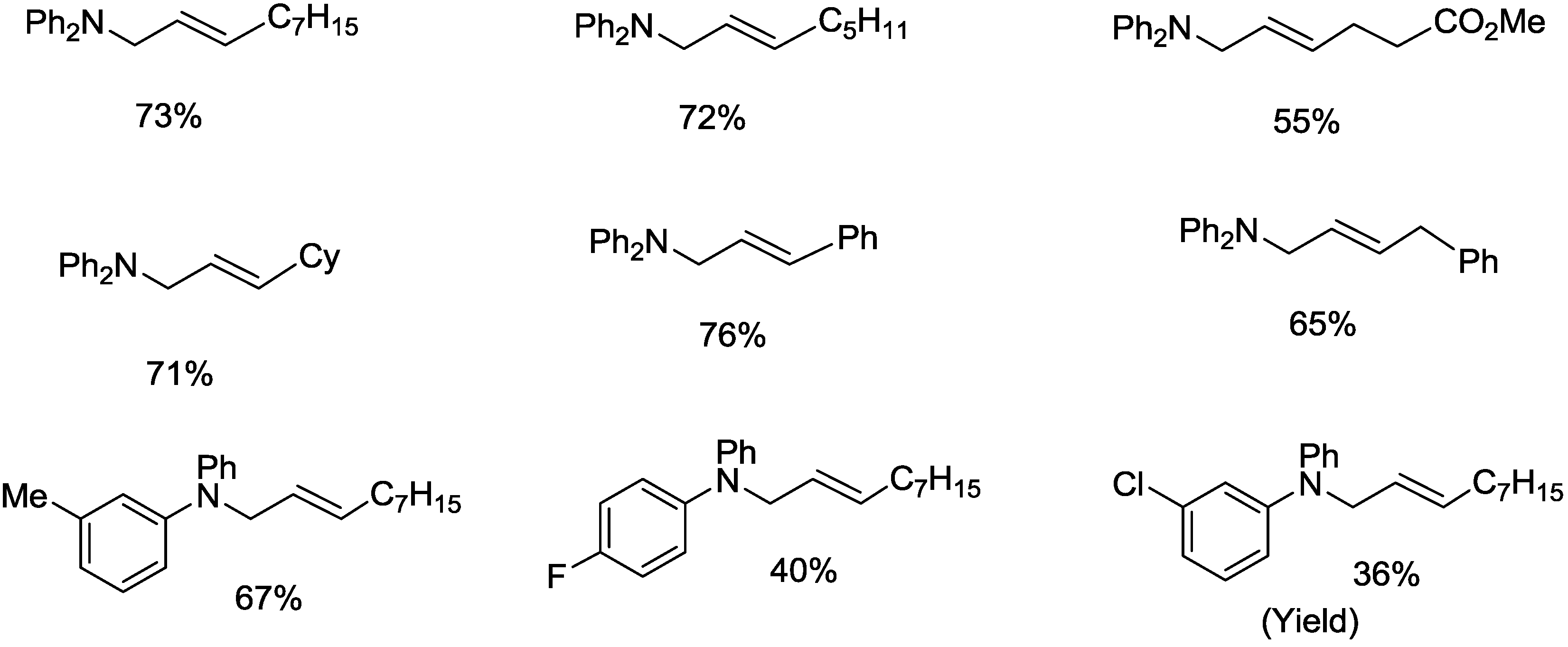 Under the optimized conditions, the reactions of various diarylamines with aliphatic alkenes afforded the corresponding allylamine derivatives in good yields (Scheme 4). Simple alkenes such as 1-octene, 1-dodecene, allylcyclohexane, allylbenzene, and 4-phenyl-1-butene reacted smoothly with 1, affording the corresponding (E)-allyamines in good yields with high selectivities. The reaction also tolerated various secondary aromatic amines such as 3-methyldiphenylamine and 3-fluorodiphenylamine, and the reaction with 5 produced the corresponding allylic amines in moderate to good yields (Scheme 4). However, the reactions with aliphatic amines such as hexylamine and dibutylamine were sluggish, because strong coordination of these more basic amines to the Pd center deactivates the Pd and NPMoV species.