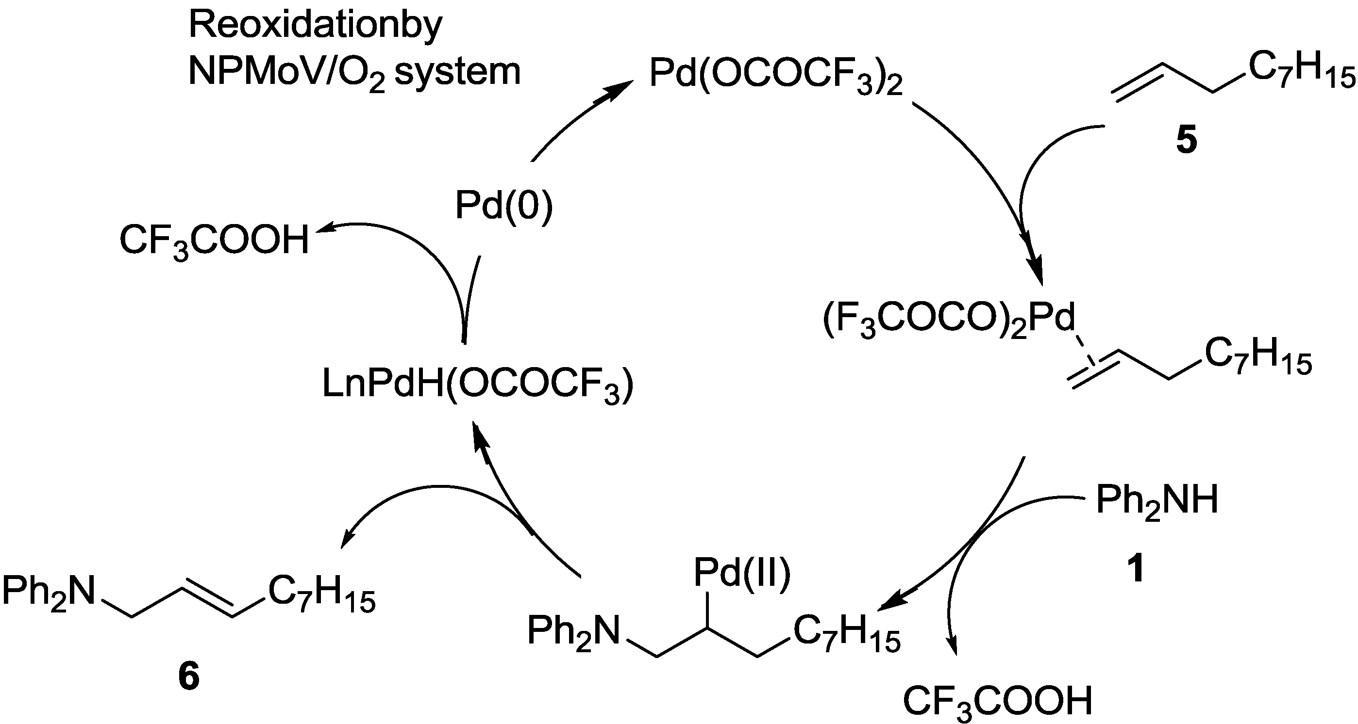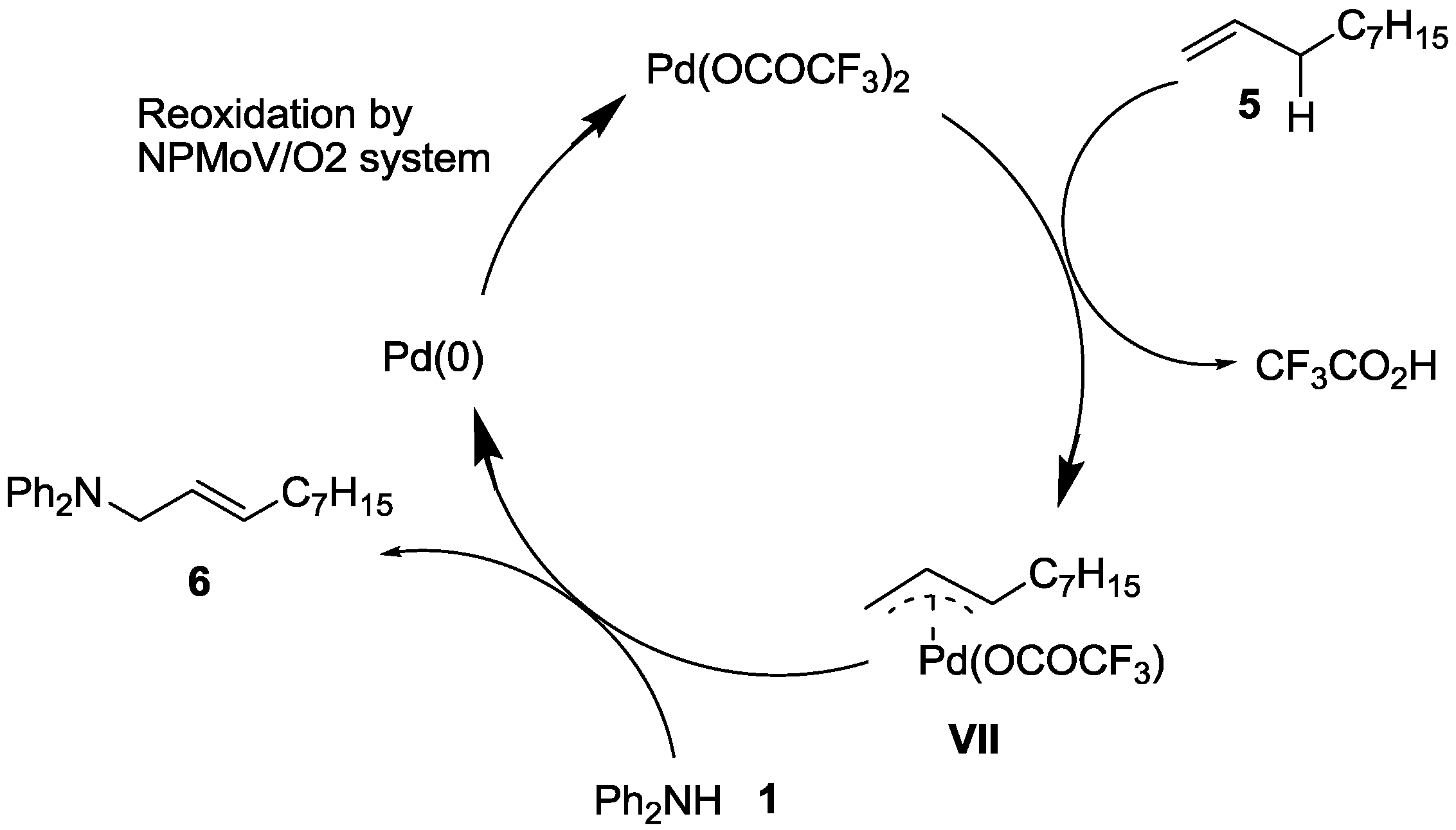 Based on these results, the most plausible reaction pathway is shown in Scheme 5. First, Pd(II) reacts with alkene 2 to form an η3-allylpalladium intermediate VII, along with trifluoroacetic acid, through allylic C–H bond activation. The trifluoroacetate group on the Pd(II) complex smoothly abstracts the allylic hydrogen to form η3-allylpalladium bearing a trifluoroacetate group. Then, VII is subjected to nucleophilic attack by amine 1 to afford the oxidative allylic amination product and Pd(0). The trifluoroacetate group facilitates the amination step, as we demonstrated in the stoichiometric reaction of 7 with 1 (see Equation 5). The resulting Pd(0) species is smoothly reoxidized by the NPMoV/O2 system to generate Pd(II) (Scheme 5).