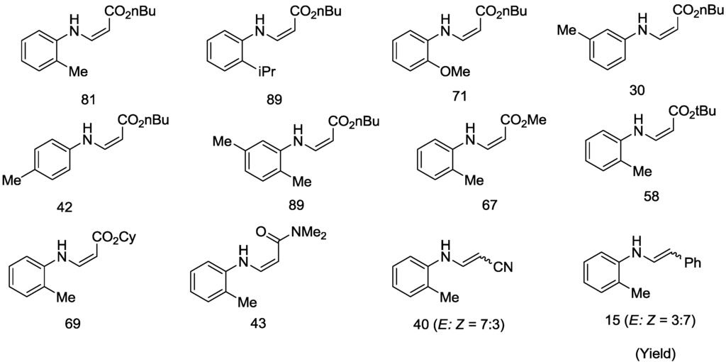 Under the optimized conditions, various primary anilines and electron-deficient olefins were tolerated in the oxidative amination (Scheme 7). As mentioned above, the use of ortho-substituted anilines such as o-toluidine, o-isopropylaniline, and o-anisidine gave high yields (71–81%) of the corresponding enamines, with high levels of regio- and stereo-selectivity (E:Z = 1:>20). In contrast, when m- and p-toluidine were used, the yields of the corresponding enamines decreased (30–42%), but high levels of Z selectivity were retained. These results suggest that the bulky o-methyl substituent effectively hampered over-coordination (or saturation) of the aniline nitrogen to the Pd center, preventing deactivation of the catalyst in the catalytic cycle. Under these conditions, various electron-deficient olefins were tolerated, and gave the corresponding enamines in good yields. When acrylonitrile and styrene were used as the olefins, the yields of the desired products were low (15–40%), and lower stereoselectivities of the desired products were observed. These results suggest that the carbonyl group plays an important role in determining the stereoselectivity during the course of the reaction. Under these reaction conditions, the use of amides such as phthalimide (as less-basic amide), cyclooctylamine (as more-basic aliphatic amine) are totally inactive toward the oxidative amination.