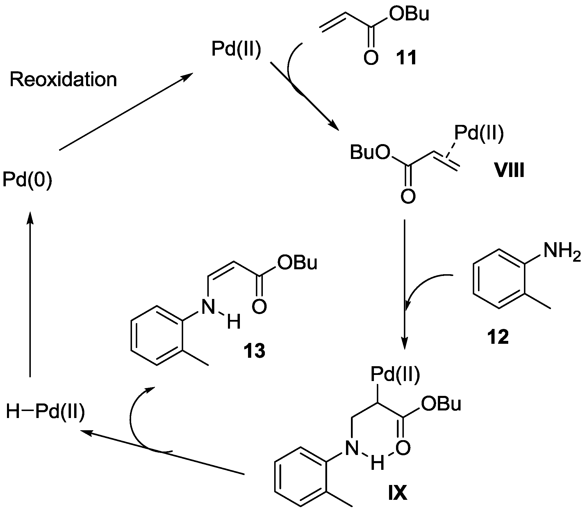 A plausible reaction mechanism for this reaction is shown in Scheme 8. Similar to the reactions reported in Section 2.1 and Section 2.2, the coordination of olefin 2 to Pd(II) leads to a Pd(II) complex VIII. The intermediate VIII is subjected to nucleophilic attack by the primary amine, followed by formation of a six-membered Pd complex IX, possibly by hydrogen bonding between the carbonyl oxygen atom and the hydrogen atom of the primary amine [63]. Subsequently, β-hydride elimination from intermediate VIII generates Pd–H and the Z amination product. The palladium hydride species then readily undergoes reductive elimination to give Pd(0), and the resulting Pd(0) species is smoothly reoxidized by O2 to Pd(II).