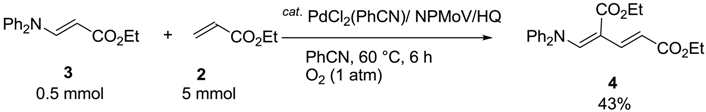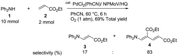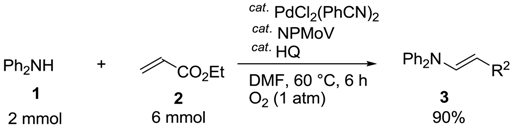 First, we focused on aza-Wacker type reactions of secondary amines with electron-deficient olefins, affording enamines as the products. We found that the PdCl2(PhCN)/NPMoV/O2 system combined with a catalytic amount of HQ had good catalytic activity in oxidative amination reactions, exclusively affording (E)-enamines in good yields. The reaction of diphenylamine (1) with ethyl acrylate (2) was chosen as a model reaction. When a mixture of 1 (2 mmol) and 2 (6 mmol) was reacted in the presence of PdCl2(PhCN)2 (0.1 mmol, 5 mol%) combined with (NH4)5H4PMo6V6O40 23H2O (NPMoV) (0.02 mmol, 1 mol%) and HQ (0.4 mmol, 20 mol%) in dimethylformamide (DMF) (2 mL), under atmospheric oxygen (1 atm, balloon) at 60 °C for 6 h, (E)-ethyl-3-(diphenylamino)propenoate (3) was obtained in 90% yield (Equation 1).