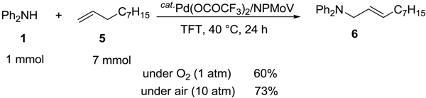 The reaction of diphenylamine (1) with 1-decene (5) was chosen as a model reaction, and carried out under various conditions. When 1 (1 mmol) was reacted with 5 (7 mmol) in the presence of Pd(OCOCF3)2 (0.1 mmol) and (NH4)5H4PMo6V6O40 23H2O (NPMoV) (0.02 mmol) in trifluorotoluene (TFT) (1 mL) under O2 (1 atm) at 40 °C for 24 h, (E)-1-diphenylamino-2-decene (6) was obtained in 60% yield (Equation 4). In further screening of the reaction conditions, when the reaction was performed under 10 atm of air, the highest yield, 78%, was achieved (Equation 4). The reaction proceeded with high levels of stereo- and region-selectivity, and exclusive formation of the E isomer was obtained; no aza-Wacker-type products were detected under these conditions. The use of an excess (preferably 7 equiv.) of olefin (5) efficiently promoted the reaction. When the molar ratio of 1 to 5 was changed from 1:7 to 1:3, the yield of 6 decreased from 73% to 41%. In this reaction, the NPMoV catalyst efficiently serves in the reoxidation step with dioxygen, and the reaction in the absence of NPMoV from the catalytic system results in a sluggish reaction (15% yield).