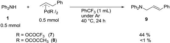 With regard to the reaction mechanism, it is known that η3-allylpalladium intermediates are formed by the reaction of alkenes with Pd(II) through allylic C–H bond activation [26,27,29]. To confirm the participation of the η3-allylpalladium intermediate as the key in the catalytic cycle, and in order to obtain further insights into the specific role of the Pd(OCOCF3)2 catalyst in this reaction, the (η3-cinnamyl)palladium trifluoroacetate dimer (7) and (η3-cinnamyl)palladium acetate dimer (8) were synthesized independently as model intermediates, according to the literature methods [61,62]. Stoichiometric reactions with diphenylamine (1) were carried out under the conditions shown in Equation 5, using the complexes 7 and 8. The stoichiometric reaction of the trifluoroacetate-substituted η3-allylpalladium 6 with 1 produced the desired allylic amine 9 in substantial yield, but almost no coupling product was obtained in the reaction with the acetate-substituted η3-allylpalladium 7. These results indicate that the formation of η3-allylpalladium species is an important factor in the present catalytic cycle, and the more electrophilic η3-allylpalladium trifluoroacetate is a suitable intermediate for further transformations with amines, affording allylic amines.
