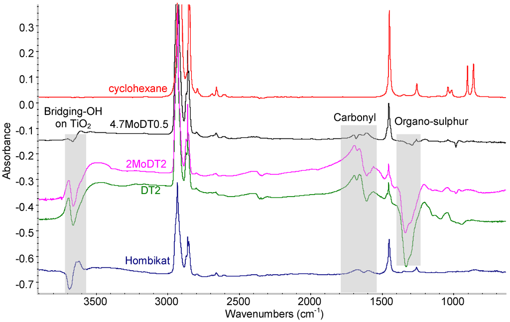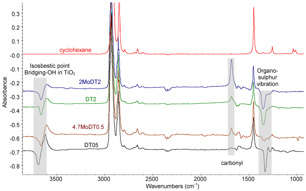 In addition, adsorbed water may be playing a role since it absorbs around 1630 cm−1 and an isosbestic point may occur. To verify that the negative peak (~1354 cm−1) was related to sulfate, an unsulfated anatase-TiO2 (Hombikat) was used as reference. The latter sample showed similar band of adsorbed cyclohexane at 1450 cm−1, weak bands of carbonyl compounds with an intensity similar to that one present on the sample with low sulfate coverage (4.7MoDT05), and different hydroxyl bands. In particular, in the presence of adsorbed cyclohexane, the hydroxyl band at 3680 cm−1 is negative, that is hindered by cyclohexane adsorption. The hydroxyls band at 3640 cm−1 is instead still present, while organo-sulfur (1350 cm−1) peak is not detectable. When organo-sulfur compounds are present, the band of hydroxyls at 3640 cm−1 is negative for the samples at high sulfate content. In the absence of sulfate, on the Hombikat catalyst, the band of hydroxyls at 3680 cm−1, instead, is negative. For this reason, the isosbestic point on the bridging-OH vibration is related to the displacement of water molecules by cyclohexane molecules, preferably interacting with hydroxyls close to the sulfate, or with OH of titania in the absence of sulfate.