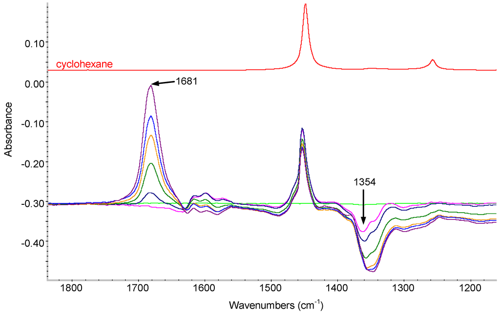 Figure 2 shows in more detail the behavior of 2MoDT2 catalyst surface during dark adsorption of gas mix 2. While the cyclohexane peak at 1450 cm−1 stabilizes in a few minutes, the signals at 1681 and 1354 cm−1 grow steadily in adsorption time, indicating a continuous surface modification. Though the peaks evolve at the same time, their behavior is not completely parallel, which indicates different surface phenomena. The 1354 cm−1 peak could originate from the oxidation of an organic molecule coupled to the sulfate. Other sulfate related vibrations could not be followed.
