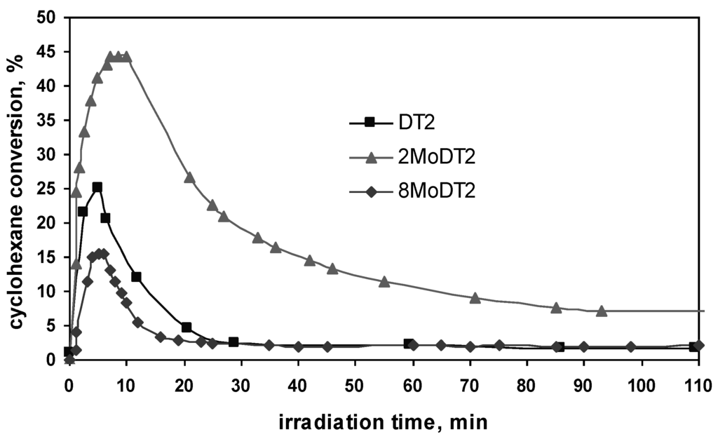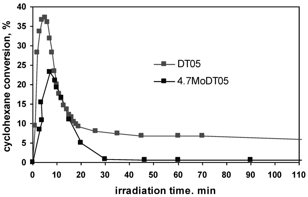 Photocatalytic tests performed on titania based photocatalysts at low sulfate coverage are reported in Figure 4. Cyclohexane conversion on DT05 and 4.7MoDT05 reached a maximum after about 8 min of irradiation time and then decreased. The strong catalyst deactivation is particularly evident after this time of irradiation.