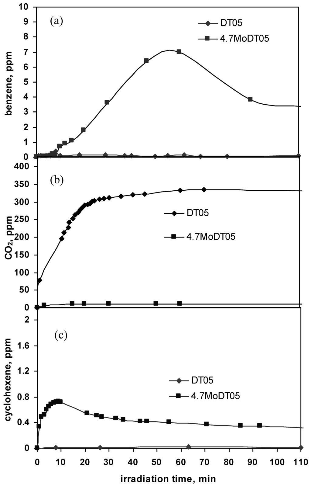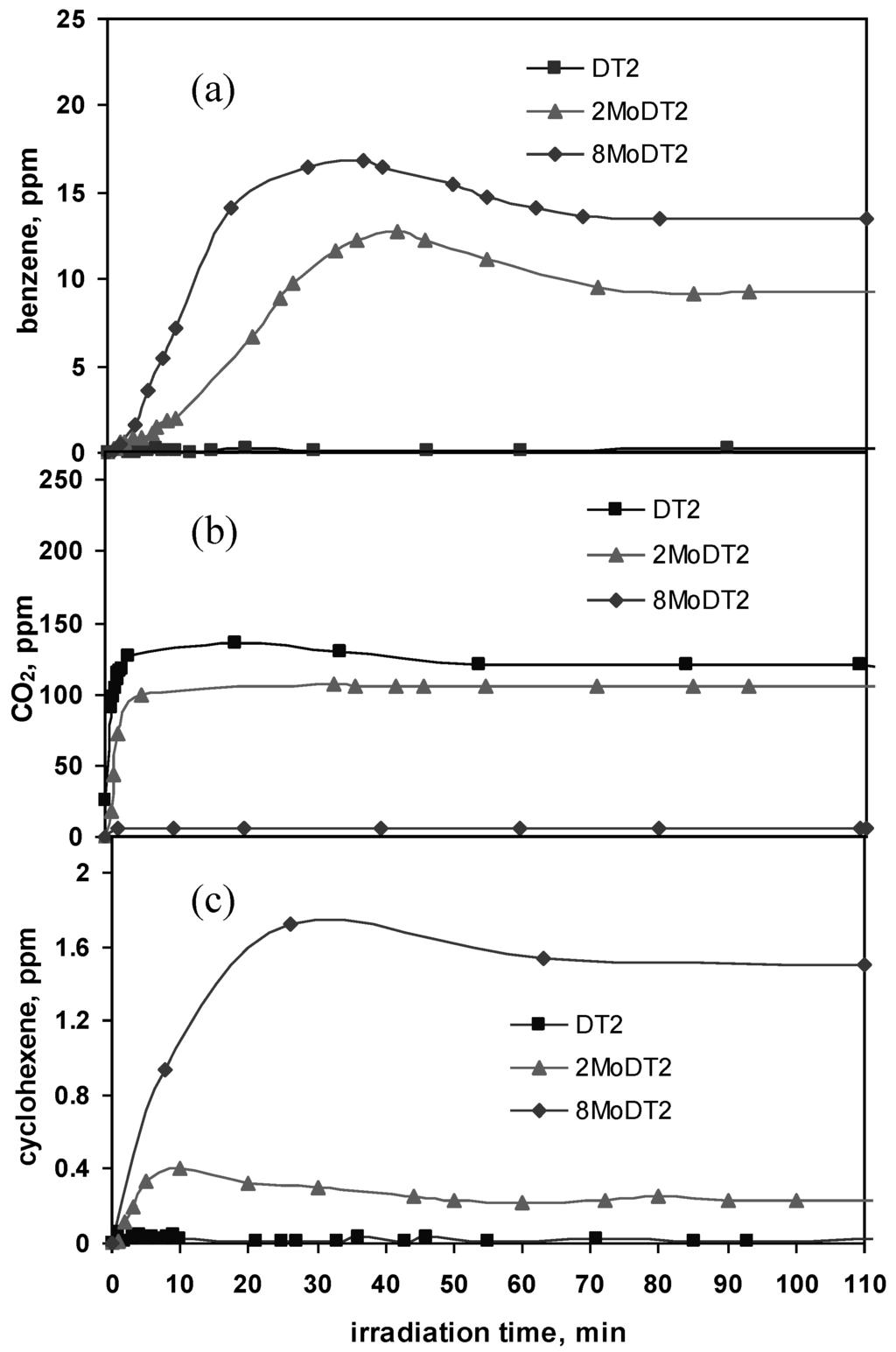 On all MoOx/TiO2 catalysts, reaction products were benzene, CO2 and few amount of cyclohexene (Figure 7). Benzene concentration showed a maximum (17 ppm after 36 min on 8MoDT2 and 13 ppm after 45 min on 2MoDT2), while CO2 concentration was 100 ppm on 2MoDT2 and 6 ppm on 8MoDT2. As observed for DT05 catalysts, the only product observed on DT2 was carbon dioxide and its concentration was the highest.