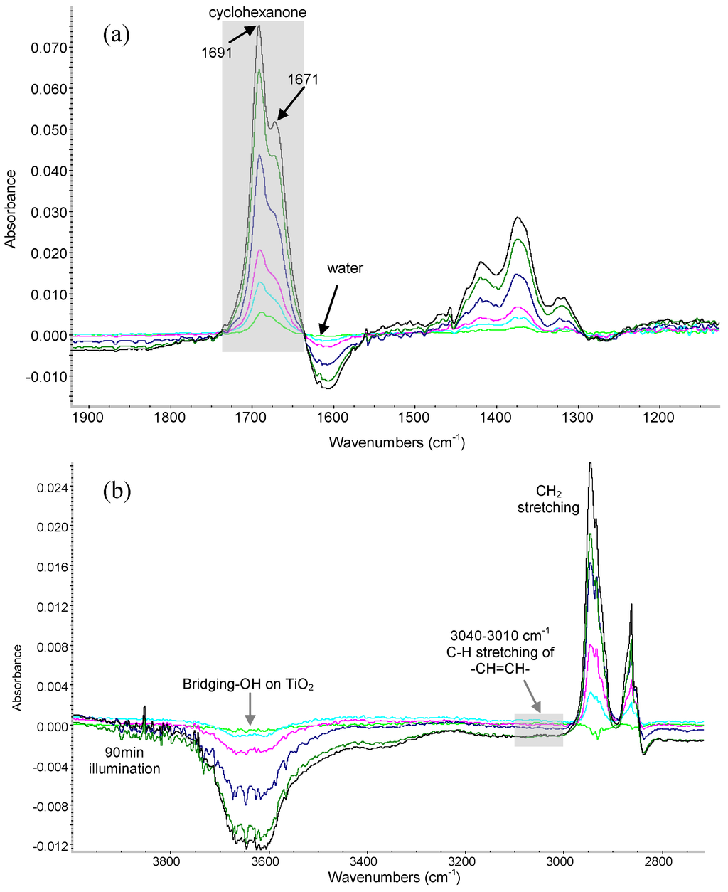 The results of photocatalytic reaction are shown in Figure 8a,b for gas mix 2. The CH stretching vibration of cyclohexane increases steadily during illumination probably because cyclohexane adsorption was still occurring, possibly as the result of light induced dehydration of the surface, making free new adsorption sites. So besides dehydration and the continued adsorption of cyclohexane on TiO2 sites, also depletion of hydroxyl groups occurs during photoreaction, as showed by the increasing negative absorption in the range 3200–3800 cm−1. This has been also observed performing the reaction in liquid phase.
