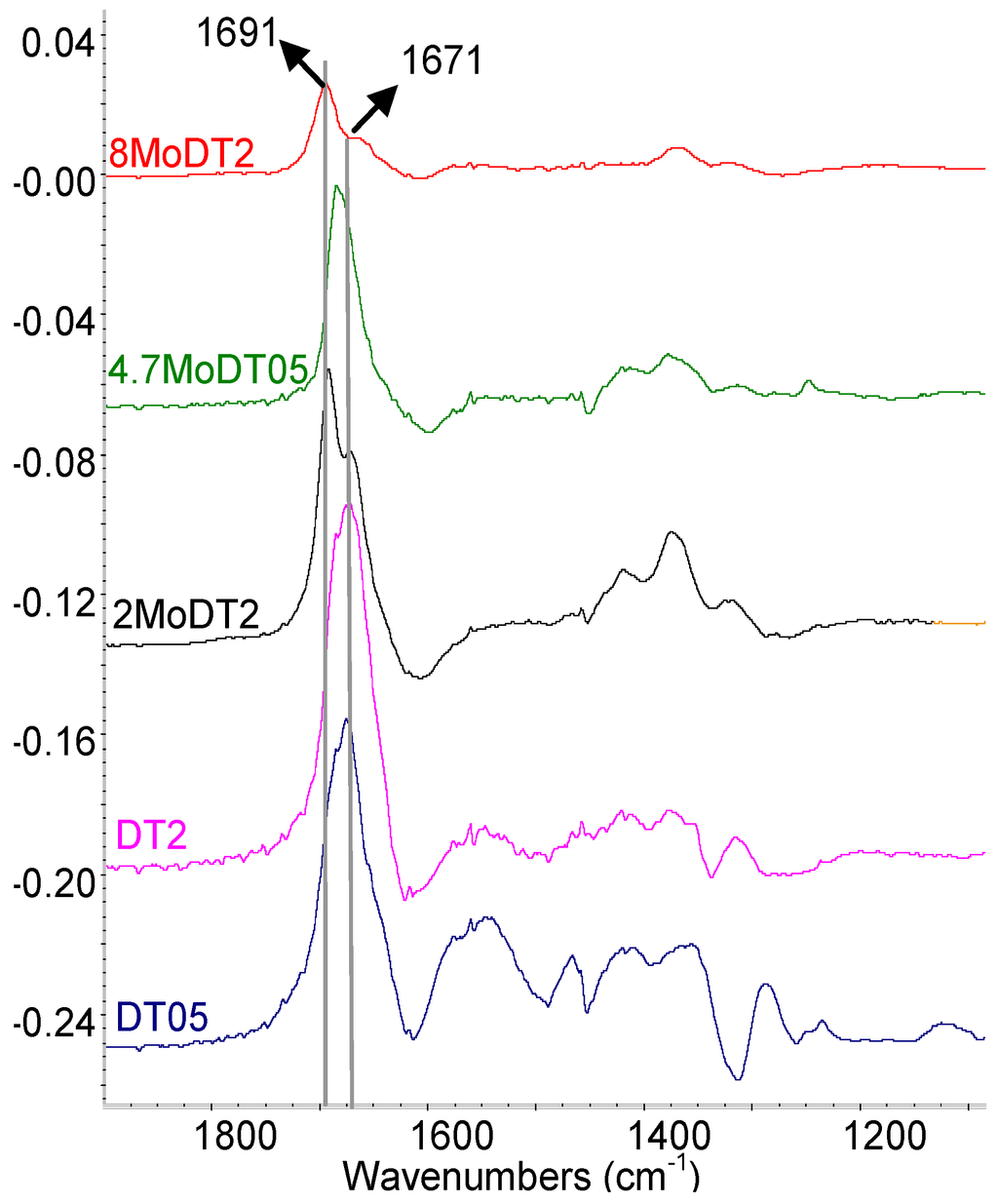 Figure 9 compares the photocatalytic activity of 8MoDT2, 4.7MoDT05 and 2MoDT2 with DT2 and DT05 supports. The DT05 and DT2 supports show similar carbonyl absorptions, with stronger 1671 cm−1 vibration. When molybdenum is added to the catalyst, a decrease in this peak is observed and the 1691cm−1 peak becomes more prominent. Similar to 2MoDT2, 8MoDT2 photocatalyst shows two bands at 1671 and 1691 cm−1. The latter signal could be ascribed also in this case to cyclohexenone. The contribution at about 1690 cm−1 is not visible for DT2 and DT05, indicating that the formation of this compound is due probably correlated to the presence of molybdenum. The band at 1690 cm−1 is also not present on 4.7MoDT05. This result could be explained considering that gas phase results on 4.7MoDT05 (Figure 4 and Figure 5) showed the lowest activity and benzene production with together a strong deactivation during UV irradiation. Therefore, in this case, the formation of carbonylic compounds is predominant. On the other hand, the formation of oxygenated products (stronger 1671 cm−1 vibration) is observed for all catalysts, and a decrease in the formation of these products occurs with increasing molybdenum loading confirmed by the decrease of the band at 1671 cm−1 when molybdenum is added on TiO2 surface.