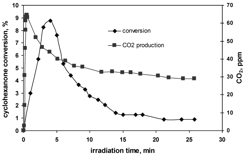 Maximum cyclohexanone conversion was about 9%, and then activity decreased to 1% in 15 min. A steady state condition was obtained after about 21 min of irradiation with a conversion of approximately 0.9%. Carbon dioxide was formed immediately after the UV sources were switched on and reached a concentration of about 60 ppm after an irradiation time of 0.5 min. CO2 was the only observed product and no other reaction products were detected in gas phase. These results evidenced that cyclohexanone (carbonyl compounds shown by DRIFTS spectra) is the precursor for CO2 production. According to DRIFTS spectra, the accumulation on surface of intermediates formed by cyclohexanone oxidation during irradiation is the responsible of catalyst deactivation.