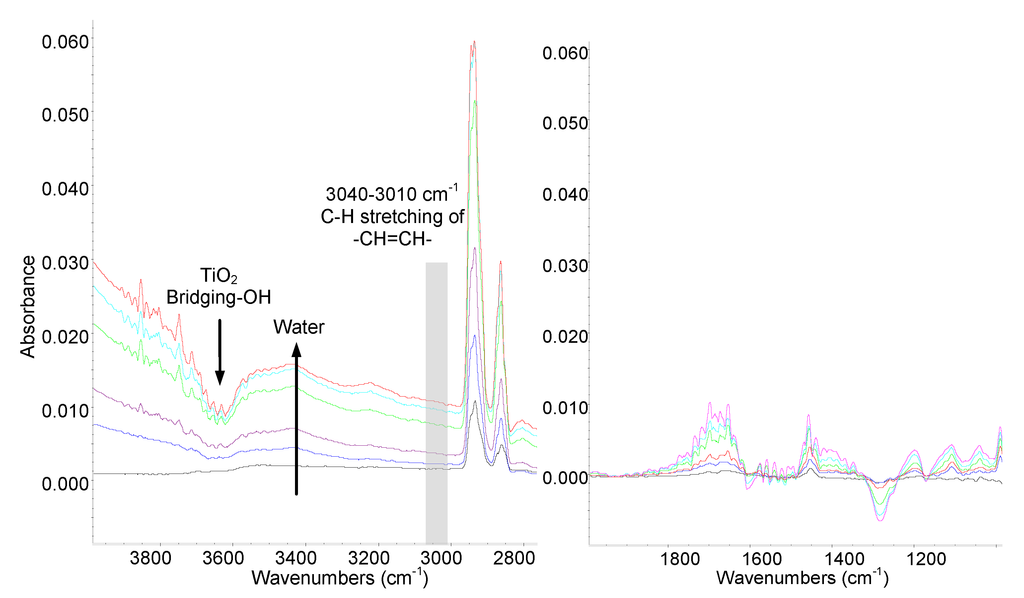 It was shown that attenuated total reflection Fourier transform infrared (ATR-FTIR) is a suitable way to monitor in real time and in situ the light-induced heterogeneous oxidations [19], allowing deeper knowledge of the complex phenomena occurring under irradiation to be obtained. ATR-FTIR technique was also performed to study the photodegradation of organic pollutants in water on TiO2 [20].