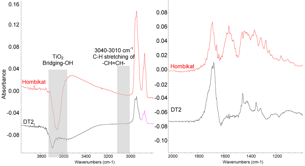 DRIFT spectra after 90 min of UV irradiation for gas mix 3 on DT2 and Hombikat catalysts.