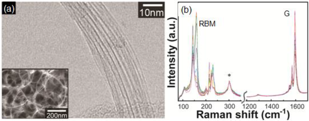 (a) Transmission electron microscopy image of SWCNTs grown using Au nanoparticles. Inset is a scanning electron microscopy image of the sample; (b) Raman spectra (overlain from 20 measurement points) of the sample. The excitation wavelength of the Raman spectra was 785 nm. The peak denoted by * is originated from Si substarte.