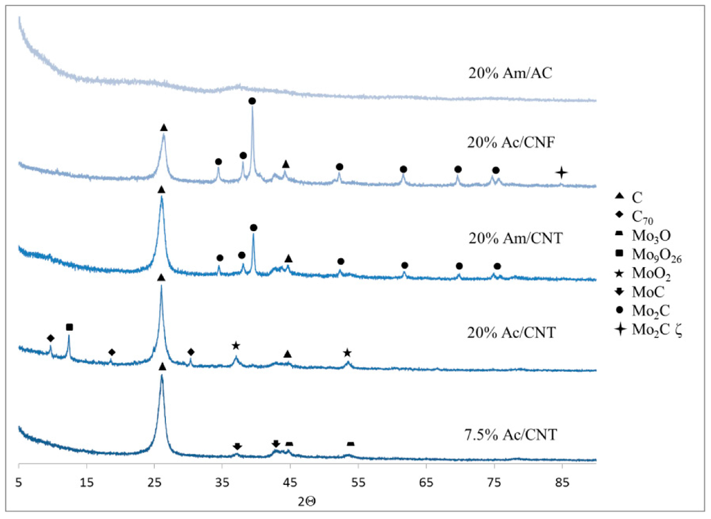 Carbon nanofibers were prepared using a floating catalyst chemical vapor deposition (CVD) method, similar to that described by Martin-Gullon [] and Weisenberger []. Multi-walled carbon nanotubes were produced via the CVD of a xylene/ferrocene feedstock between 750 and 850 °C on quartz substrates [,]. The AC employed was Darco KB-G obtained from Sigma Aldrich (St. Louis, MO, USA). Graphitization of the carbon nanotubes was performed at 2700 °C under helium as described elsewhere []. Prior to use, the surface area of CNFs and CNTs was increased by an acid treatment in which the support (2 g) was reacted with 6 M HNO3 (60 ml) at 80 °C for 3 h under vigorous stirring, after which the solids were filtered, washed with deionized water until the pH of the washings was ~7 and dried at 120 °C. AC did not require pretreatment. Each carbon support was then impregnated with either ammonium molybdate ((NH4)6Mo7O24, Alfa Aesar, Ward Hill, MA, USA) (Am) or molybdic acid (MoO3 ≥85%, Alfa Aesar, Ward Hill, MA, USA) (Ac) to afford the desired Mo loading (7.5 wt.% or 20 wt.%). The metal loadings were chosen based on previous work by Jongerius et al. [] and Qin et al. []. The impregnation was carried out by sonicating the support (1 g), deionized water (15 mL) and the prescribed amount of precursor (Am: 0.122 g to afford 7.5 wt.% loading or 0.325 g to afford 20 wt.% loading; Ac: 0.119 g to afford 7.5 wt.% loading or 0.318 g to afford 20 wt.% loading) for 1.5 h. Excess water was removed via rotary evaporation prior to drying in a vacuum oven at 120° C for 14 h. The carbide catalysts employed in this study were prepared via the carbothermal hydrogen reduction (CHR) method []. In contrast to the work of Qin and co-workers [], a carburization temperature of 700 °C proved insufficient to obtain a crystalline carbide phase. Carburization was therefore performed under a flow of 10% H2/Ar using a ramp rate of 5 °C/min to 1000 °C followed by an isothermal step at this temperature lasting 3 h. After cooling to room temperature, the catalyst was passivated under a flow of 1% O2/N2 for 8 h.