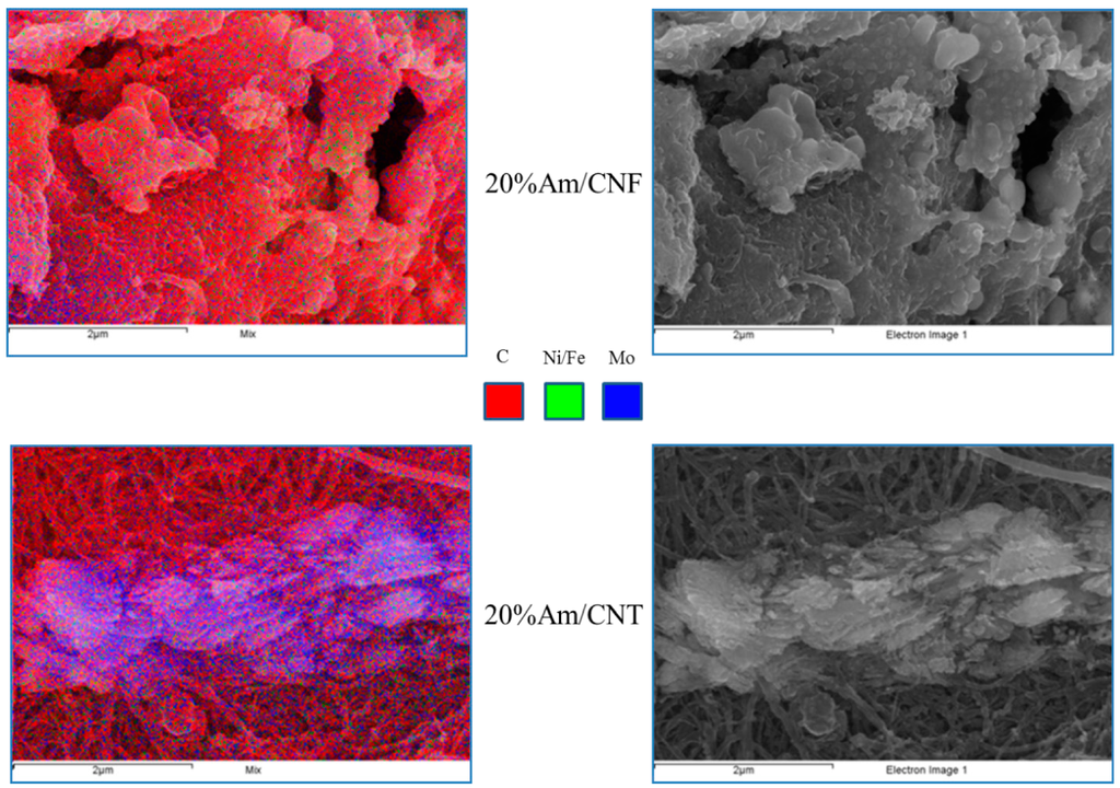 Scanning electron micrographs of 20% Am/CNF and 20% Am/CNT: EDX analysis (left) and backscattered electron images (right).