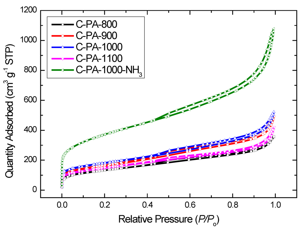 Figure 1 shows the nitrogen sorption isotherm of the as-synthesized carbon materials. It is seen that all curves show a similar shape of the typical Type-IV isotherm, which indicates the mesoporous nature of the synthesized carbon (see Figure S1). Pore parameters are then extracted from the isotherms and listed in Table 1. It is seen that the specific surface area increases from 470 to 629 m2·g−1 with increasing the pyrolysis temperature from 800 to 1000 °C, which can be ascribed to the deepened decomposition in this course. Then, a further increase in the pyrolysis temperature to 1100 °C results in a decrease in the specific surface area, which may be linked to the collapse of the carbon framework. A similar trend is also seen in the specific pore volume, which reaches the highest value of 0.81 cm−3·g−1 at 1000 °C. It is noted that the post-treatment in NH3 yields a dramatic increase in the specific surface area (1312 m2·g−1), which can be attributed to the gasification of amorphous carbon and the consequent formation of micro-/meso-pores in the active atmosphere [27,28,29].