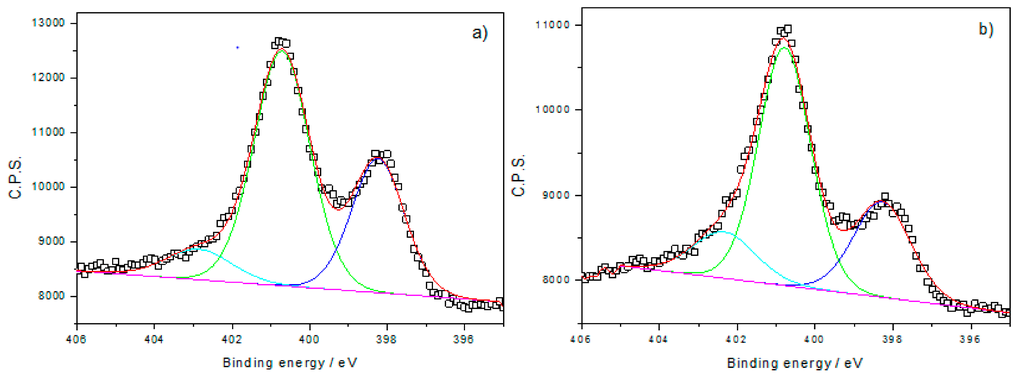 Figure 2 shows the high-resolution XPS spectra of N 1s. These spectra can be deconvoluted to three peaks based on the binding energy: 398.4 ± 0.2, 401.0 ± 0.1 and 401.5–404 eV, which respectively correspond to pyridinic-nitrogen, graphitic-nitrogen and nitrogen-oxide [30,31]. Then, the content of each species is seen in Table 3. It is seen that the graphitic nitrogen is the predominant component among the three species, of which the content slightly increases with the pyrolysis temperature. In comparison, the content of the pyridinic-nitrogen decreases from 31.88% to 17.90% with increasing the pyrolysis temperature from 800 to 1100 °C. These results are consistent with the previous findings that the graphitic nitrogen is the most stable nitrogen species at high temperatures [32,33]. Finally, C-PA-1000-NH3 shows an extraordinarily high content of pyridinic-nitrogen (40.31%), which should be attributed to the nitrogen doping at the edge of the graphite plane during the NH3-etching process. It seems that the content of the graphitic nitrogen decreases to 49.88% in the etching process; however, it should be noted that the “absolute” content of this species remains unchanged, as compared with the un-etched one, by considering the total nitrogen content (see Table 2).