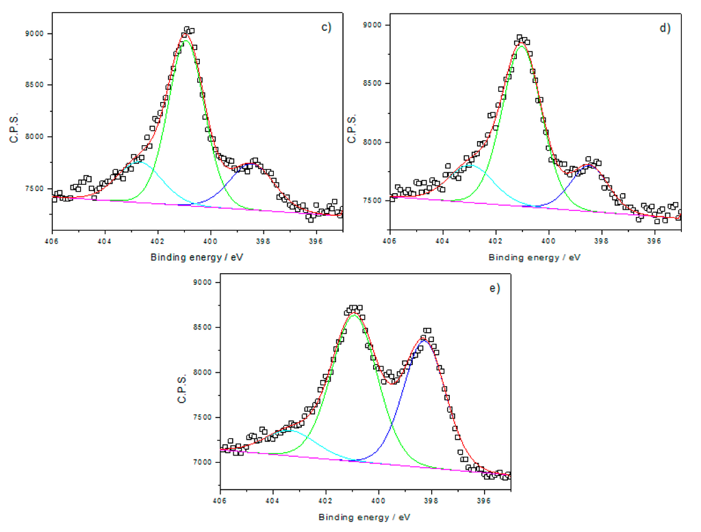 N 1s peak and the peak fitting results of the following materials: (a) C-PA-800; (b) C-PA-900; (c) C-PA-1000; (d) C-PA-1100; and (e) C-PA-1000-NH3. The unit of y-axis unit is counts per second (C.P.S.).