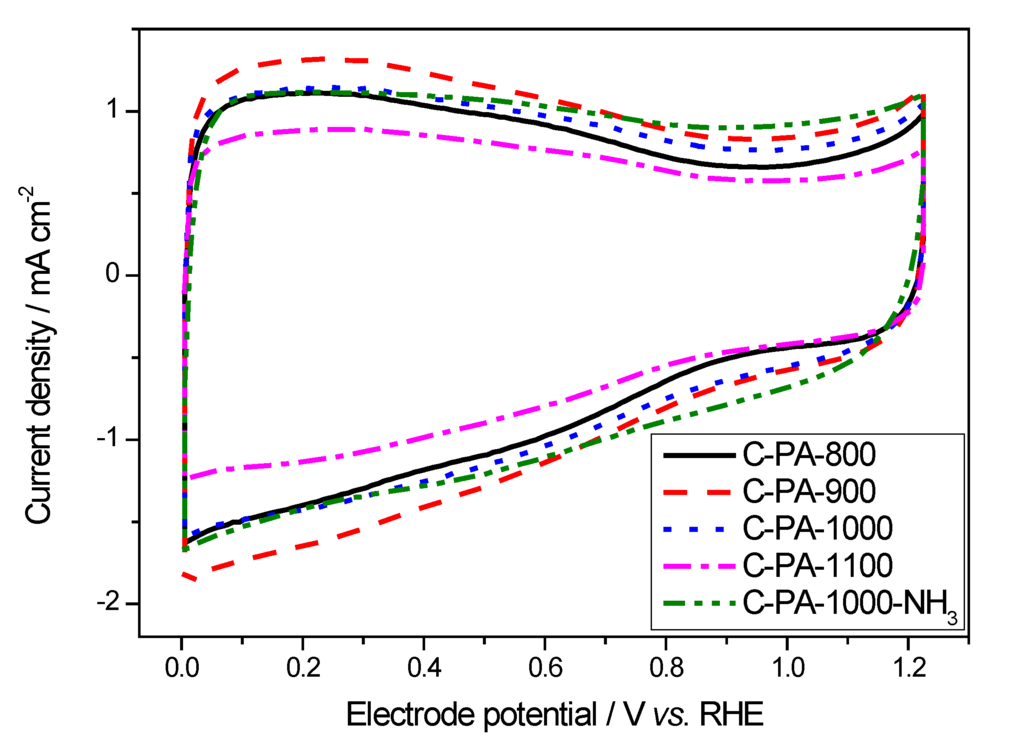 Figure 3 shows the CV curves in Ar-saturated 0.10 M KOH. It is seen that all of the curves are similar in shape with large capacitance currents, and broad symmetrical redox peaks are found in the potential range of 0 to 0.9 V. It is understandable that a large capacitance current should result from the high specific surface area, and the pseudocapacitance current is associated with the chemical adsorption of OH− onto the enriched redox couples. Basically, the capacitance current shows a volcano-shape relationship with the pyrolysis temperature, which first increases and then dramatically decreases at temperatures of 1100 °C. Notably, C-PA-1000-NH3 shows the largest capacitance current. Such a change can be rationalized as a result of the specific surface area (vide supra). In comparison, the pseudocapacitance current shows a monotonic decrease with increasing pyrolysis temperature. Additionally, this result should be associated with the deepened decomposition of the electrochemically-active functional groups (like nitrogen-containing species) on the surface at higher temperatures. In line with the above analysis, C-PA-1000-NH3 should yield the largest pseudocapacitance/capacitance currents due to its extraordinarily high specific surface area and nitrogen content. However, the increase in the capacitance current is not that large, and the pseudocapacitance current does not increase. This seeming contradiction may be understandable by considering the pore structure. The NH3 post-treatment can effectively gasify/etch the amorphous carbon, leaving enriched micropores in the bulk. Additionally, these pores may not be fully utilized due to the lack of contact with the liquid electrolyte.
