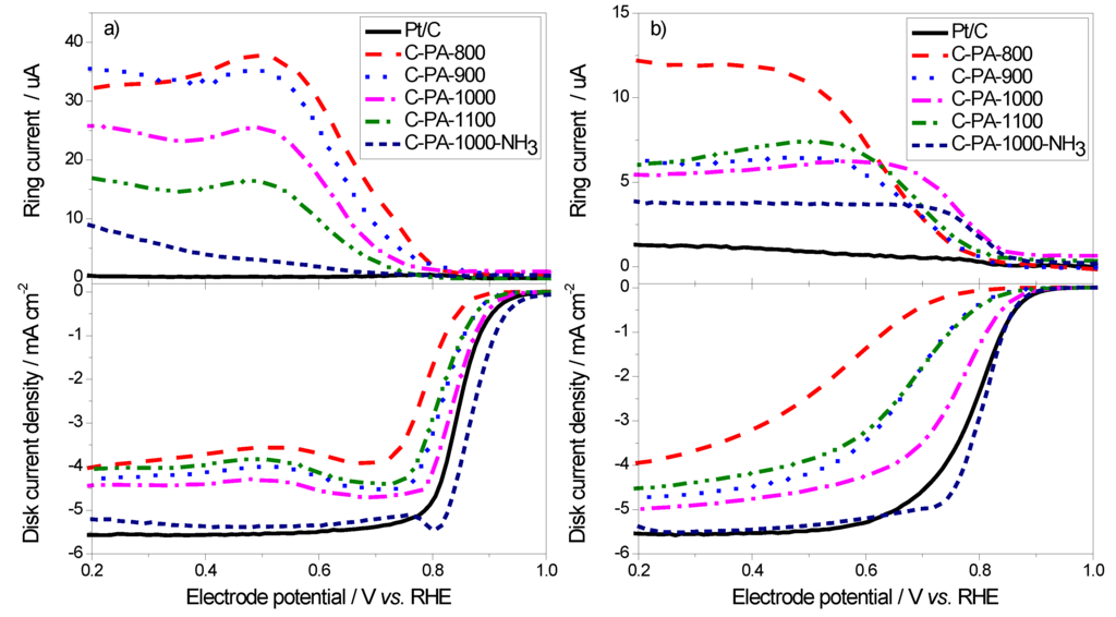 Figure 4 shows the polarization curves of the carbon materials in O2-saturated 0.10 M KOH and 0.10 M HClO4 solutions. Figure 4a shows that in alkaline media, the electrocatalytic activity shows a volcano-shape relationship, which increases with the pyrolysis temperature from 800 to 1000 °C and then decreases at 1100 °C. The same trend is further seen in the change of the yield of hydrogen peroxide and electron transfer number (see Figure S4a). Increasing the pyrolysis temperature lowers the yield of hydrogen peroxide, and thereby, selectively favors the 4-e reduction of oxygen. Such a trend in the electrocatalytic activity and selectivity correlates well with the change in the content of nitrogen-activated carbon and the specific surface area (vide supra). These findings further confirm that the active sites for the ORR should be the nitrogen-activated carbon atoms [24,26]. In acid media, the change in the electrocatalytic activity is similar to that in alkaline media (Figure 4b), revealing that the active site should remain substantially the same in a wide range of pH. Finally, it is noted that for C-PA-1000-NH3, both the activity and the selectivity are considerably improved upon NH3-activation. This result quantitatively agrees with the change in the specific surface area and the content of nitrogen-activated carbon, as discussed above. However, it seems irrational to directly correlate the small increase in the nitrogen-activated carbon (Table 4) with the extremely high activity and low H2O2 yield. The mechanism has not been fully understood yet, but the reason may be associated with high content of the pyridinic-nitrogen after the NH3 treatment.