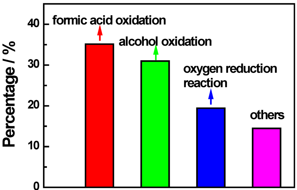 Fuel cells convert chemical energy directly into electrical current without combustion. The first article illustrating such a device was published at the end of the 1830s [1], and the interest in this field has been growing since the 1950s [2]. Among various types of the low-temperature fuel cells, proton exchange membrane fuel cells (PEMFCs) are attractive power sources for portable, automotive and stationary applications due to their high energy density, high efficiency and low operating temperature. Comparing with H2 as fuel, the liquid fuels such as formic acid and ethanol have special advantage in storage and transport, which can find better applications in portable devices and make use of current gasoline system. The direct formic acid fuel cells (DFAFCs) have an open circuit potential of 1.190 V and energy density of 2086 Wh L−1. The formic acid is non-toxic and has small crossover flux. The shortcoming of DFAFCs is their relatively low energy density. Compared with formic acid, ethanol has much higher energy density of 8030 Wh kg−1. However, ethanol suffers from the sluggish reaction kinetics.