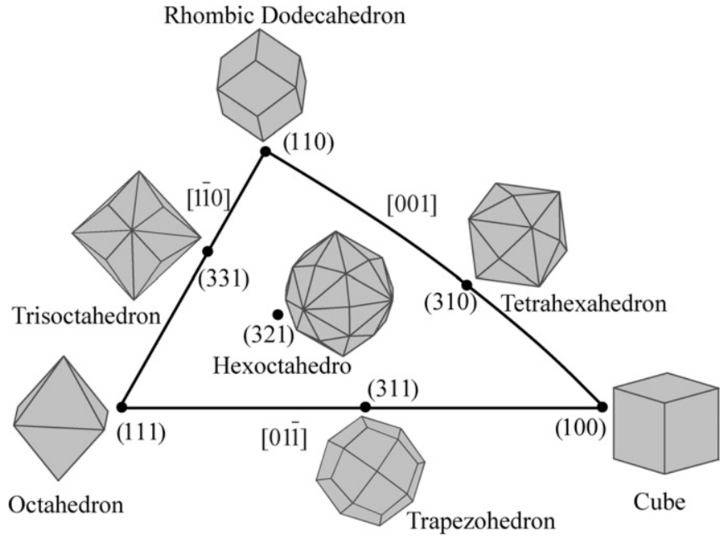 Unit stereographic triangle of polyhedral nanocrystals bounded by different crystal planes. Reproduced with permission from reference [14].