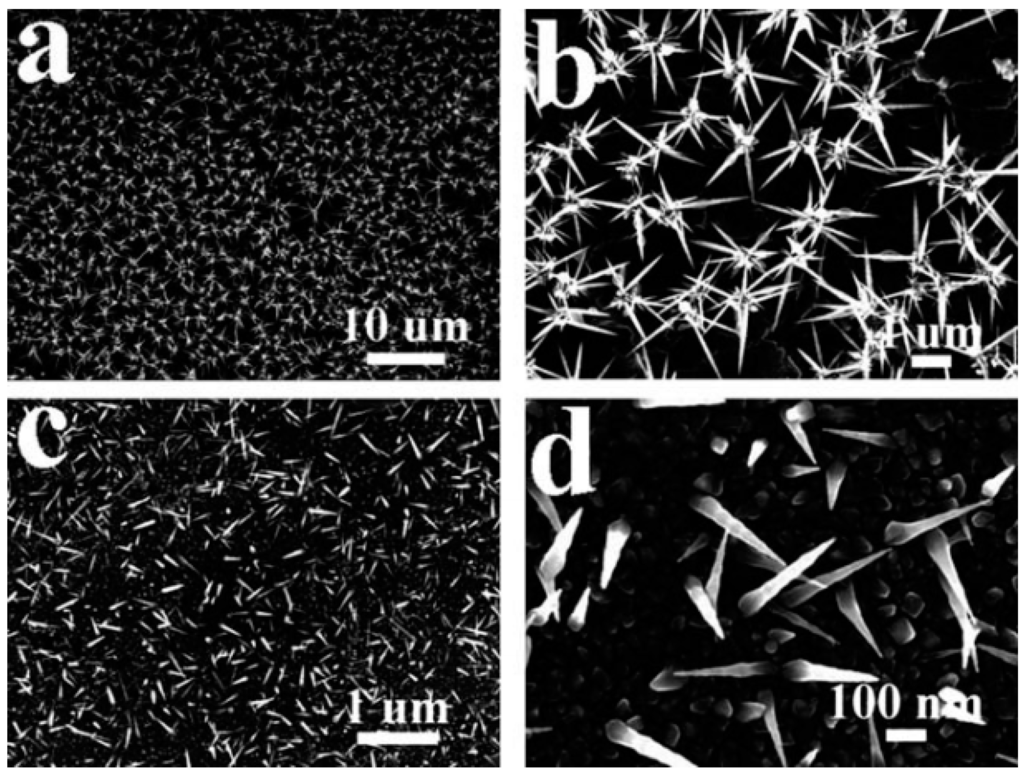 SEM micrographs of pure Pd thorn clusters (a,b) and the mixture of Pd thorns and Pd particles (c,d). Reproduced with permission from reference [19].