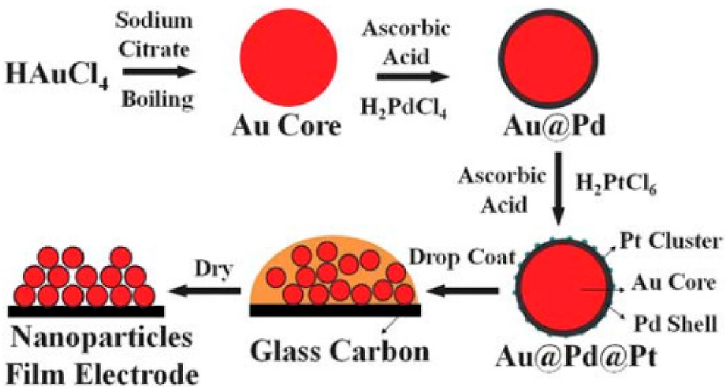 The procedure used to prepare an Au@Pd@Pt NP film on a glass carbon (GC) electrode. Reproduced with permission from reference [37].