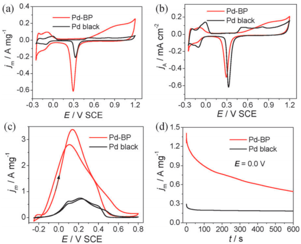 - Wu, H.X.; Li, H.J.; Zhai, Y.J.; Xu, X.L.; Jin, Y.D. Facile Synthesis of Free-Standing Pd-Based Nanomembranes with Enhanced Catalytic Performance for Methanol/Ethanol Oxidation. Adv. Mater. 2012, 24, 1594–1597. [Google Scholar] [CrossRef] [PubMed]