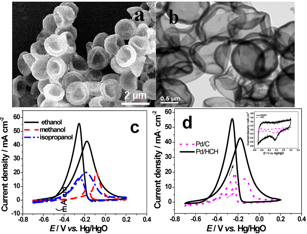 - Li, C.L.; Su, Y.; Lv, X.Y.; Shi, H.J.; Yang, X.G.; Wang, Y.J. Enhanced ethanol electrooxidation of hollow Pd nanospheres prepared by galvanic exchange reactions. Mater. Lett. 2012, 69, 92–95. [Google Scholar] [CrossRef]