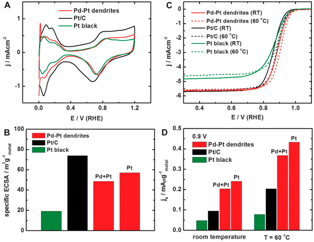 - Lim, B.; Jiang, M.J.; Camargo, P.H.C.; Cho, E.C.; Tao, J.; Lu, X.M.; Zhu, Y.M.; Xia, Y.N. Pd–Pt Bimetallic Nanodendrites with High Activity for Oxygen Reduction. Science 2009, 324, 1302–1305. [Google Scholar] [CrossRef] [PubMed]