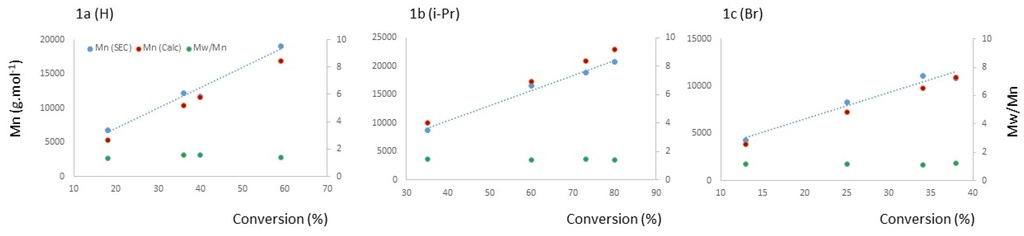 Number-average molar mass (Mn) and dispersity (Mw/Mn = Đ vs. conversion for samples 1a (H), 1b (i-Pr) and 1c (Br). Dotted blue (Mn obtained by SEC), dotted red (Mn calculated), dotted green (Mw/Mn obtained by SEC).